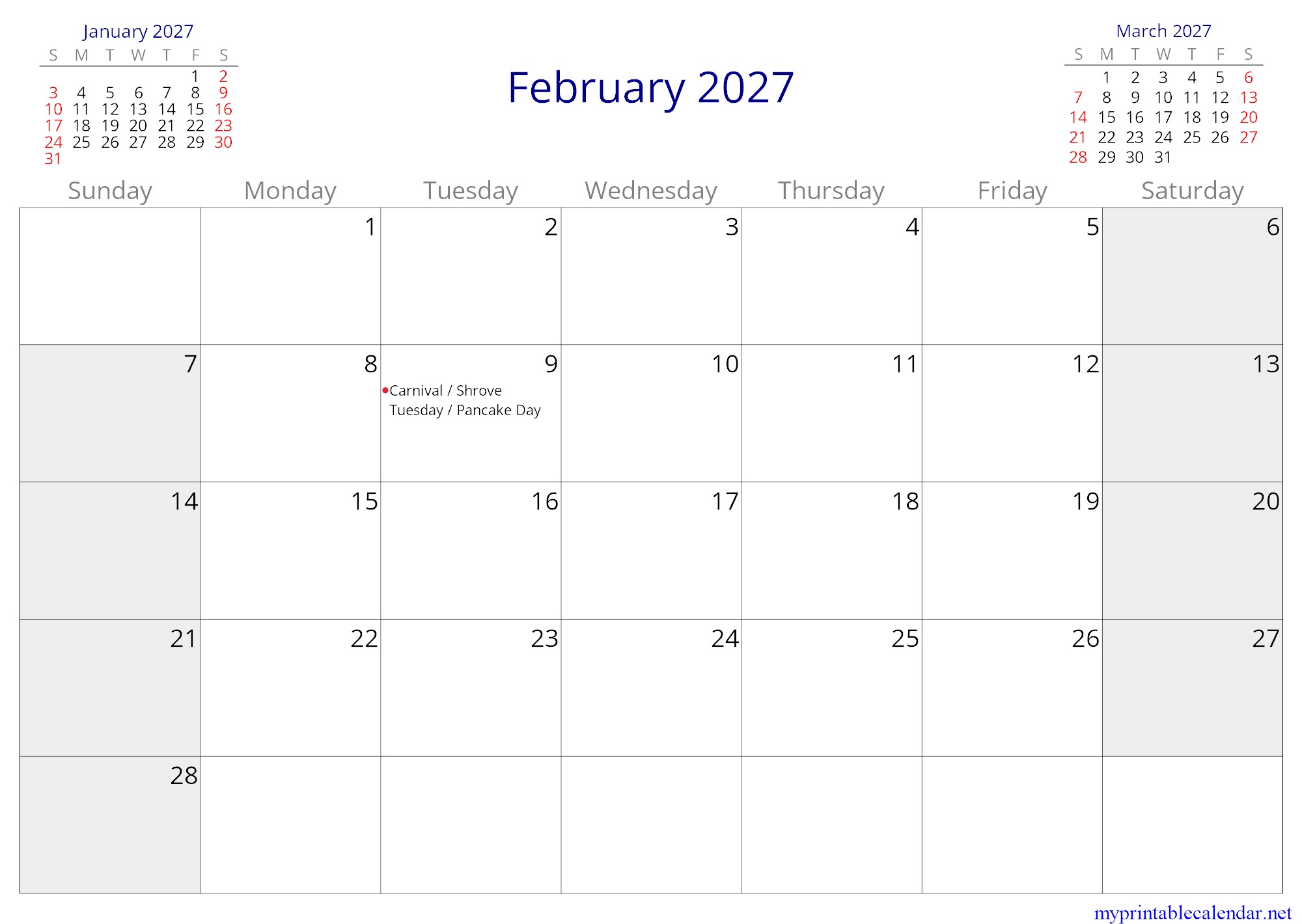 February 2027 monthly calendar, Panama, in English jpg
