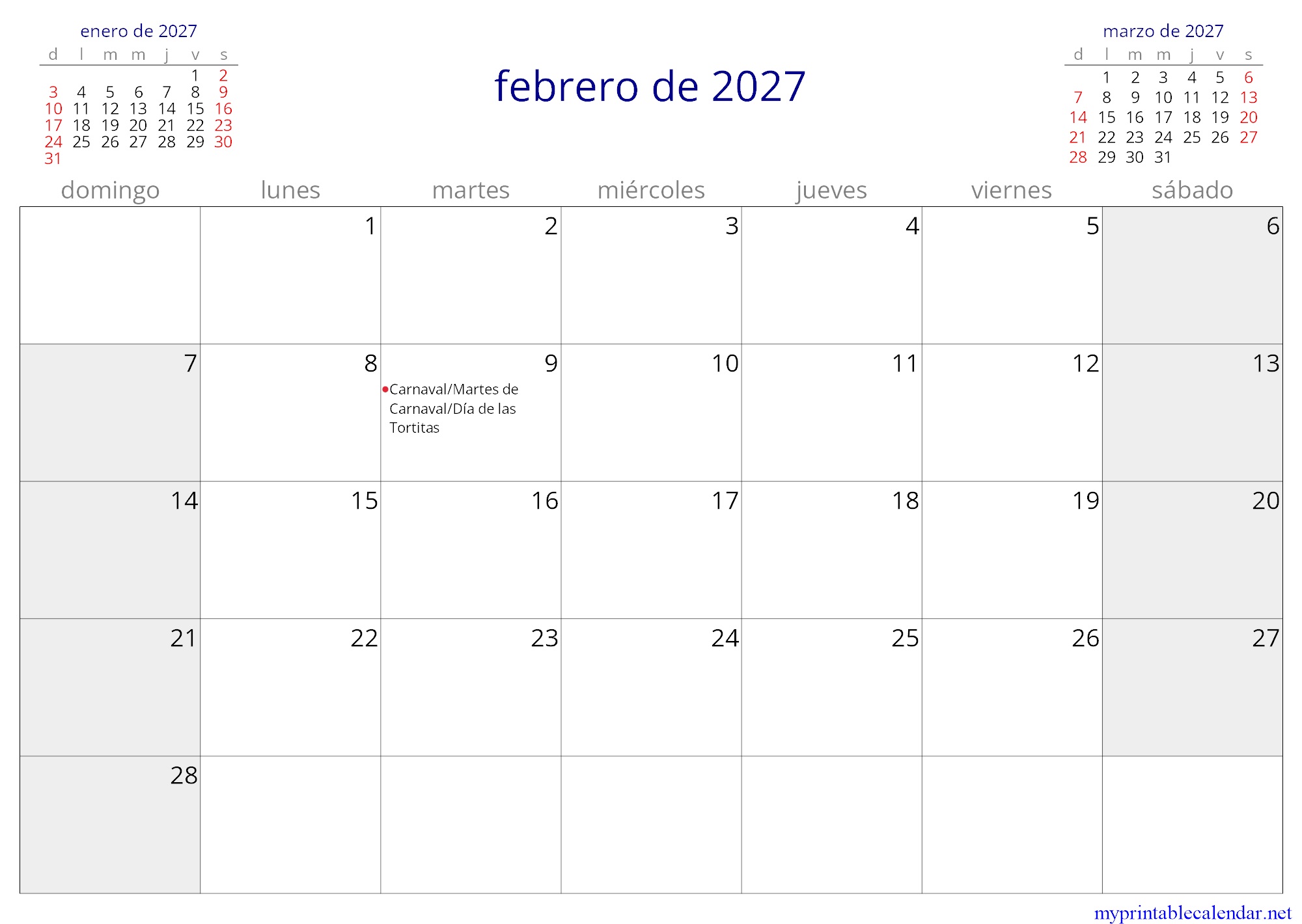 febrero de 2027 monthly calendar, Panama, Spanish jpg