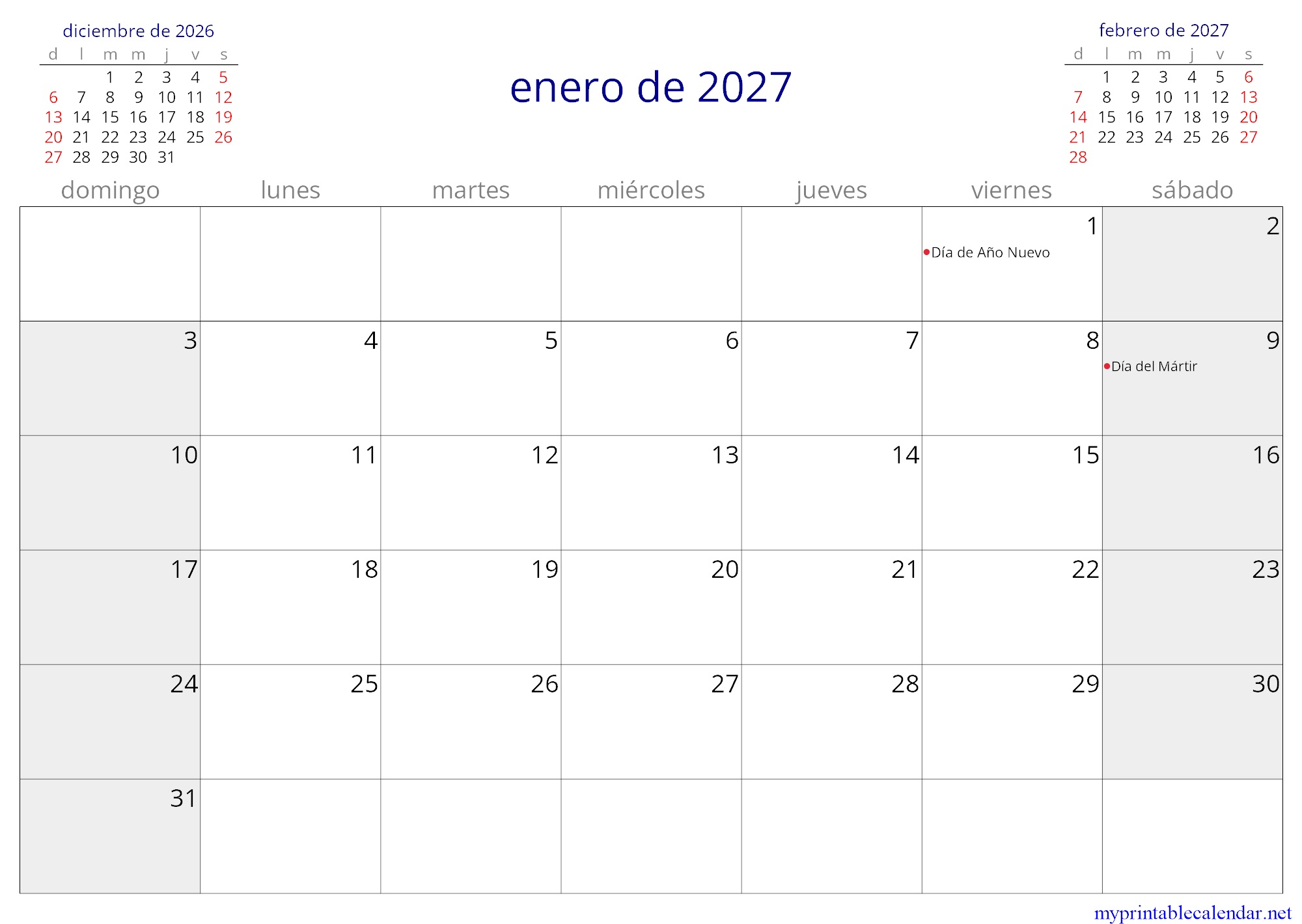 enero de 2027 monthly calendar, Panama, Spanish jpg