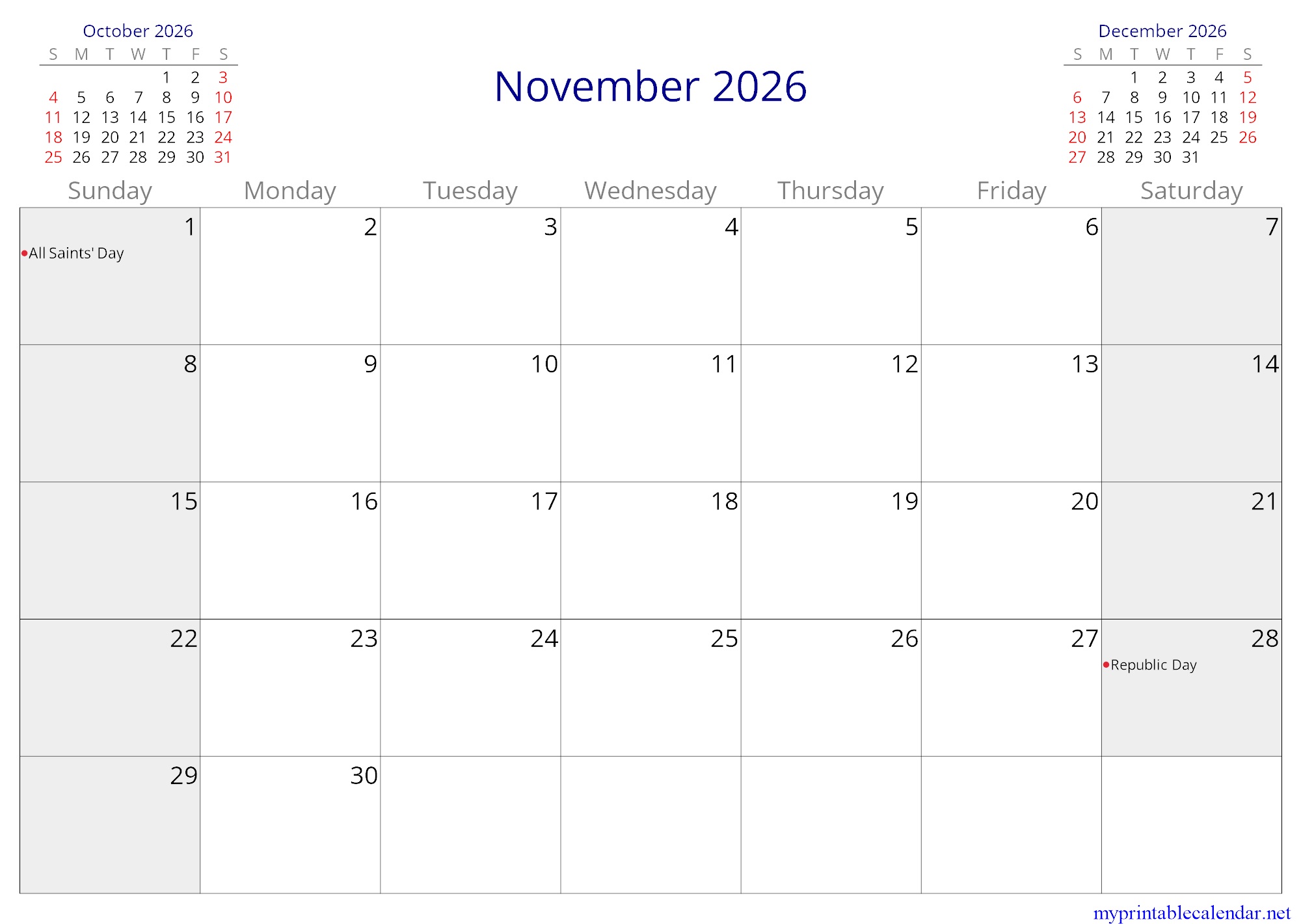 November 2026 monthly calendar, Republic of the Congo, in English jpg
