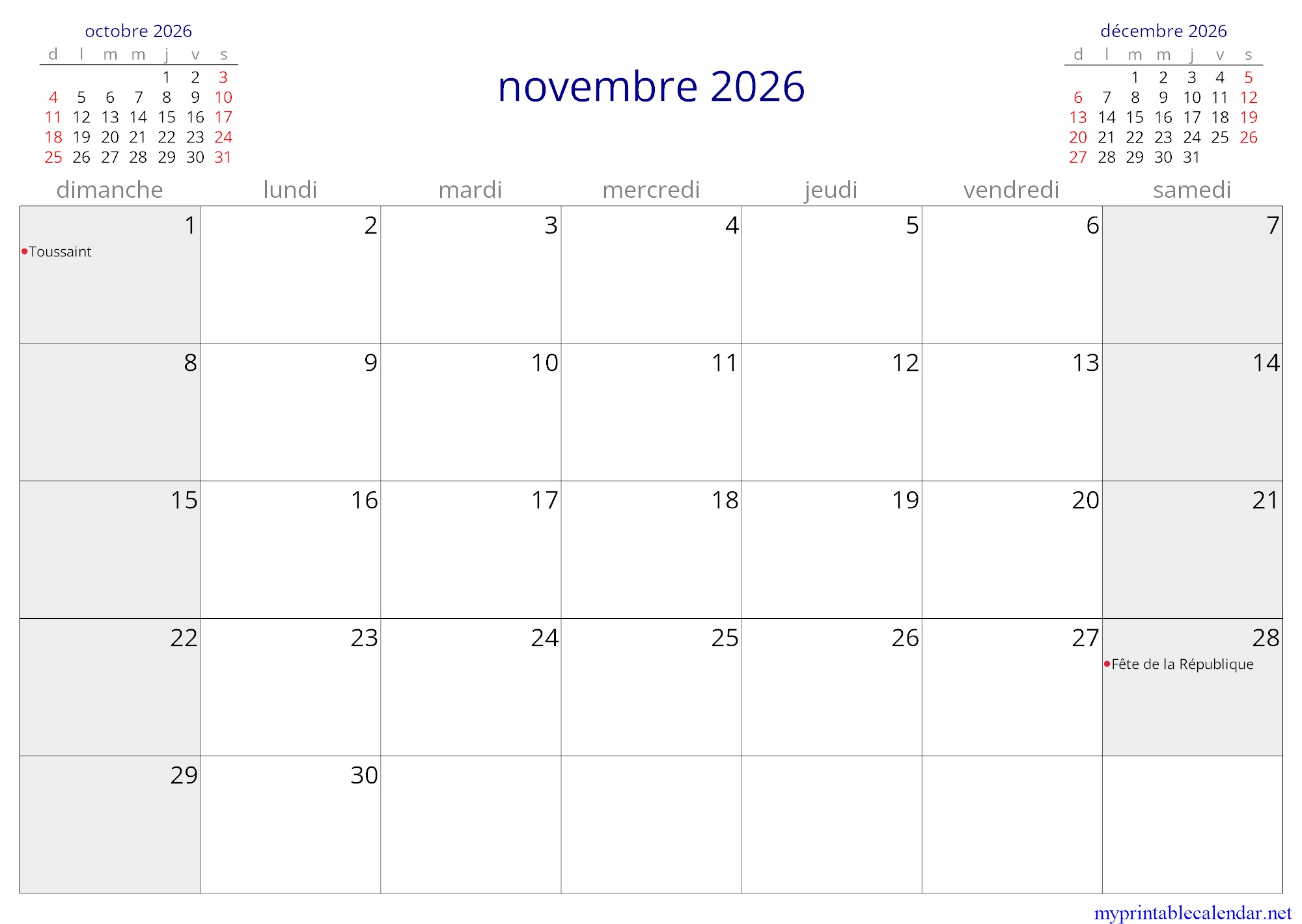 novembre 2026 monthly calendar, Republic of the Congo, French jpg