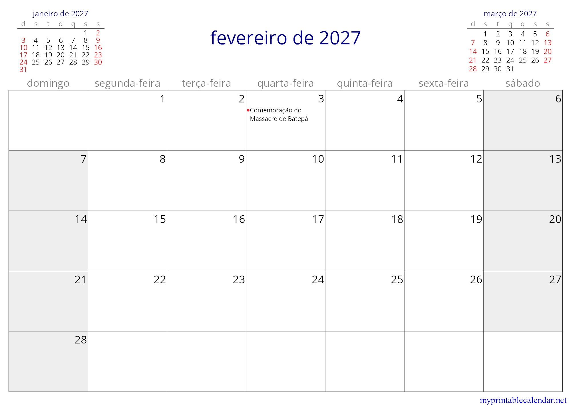 fevereiro de 2027 monthly calendar, Sao Tome and Principe, Portuguese jpg