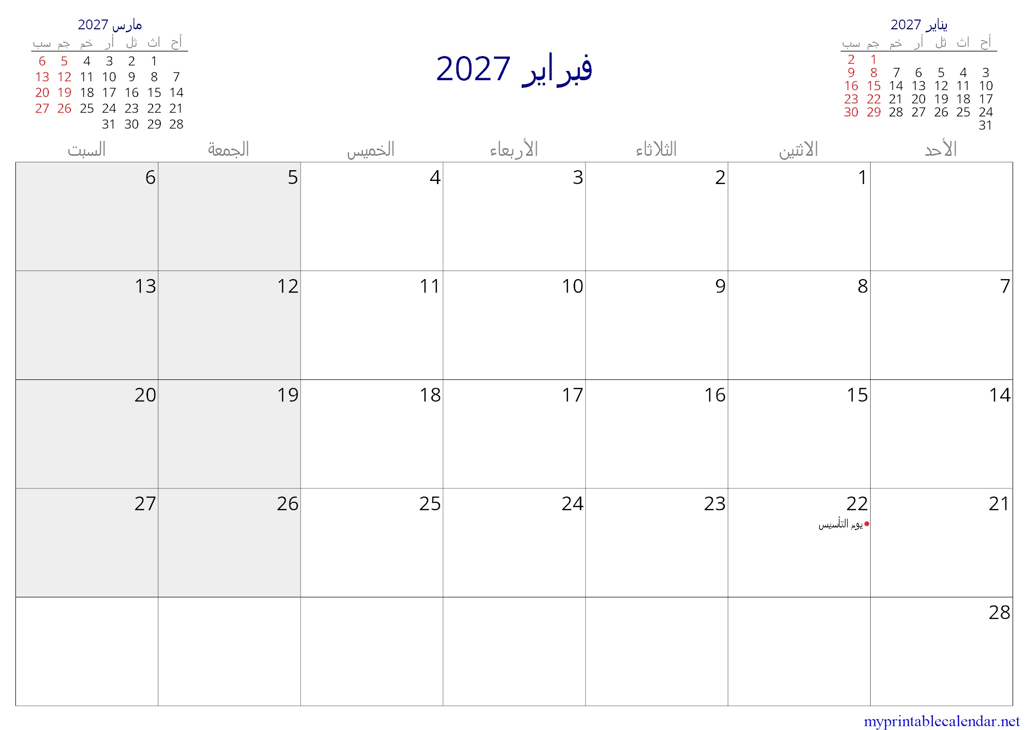 فبراير 2027 monthly calendar, Saudi Arabia, Arabic jpg