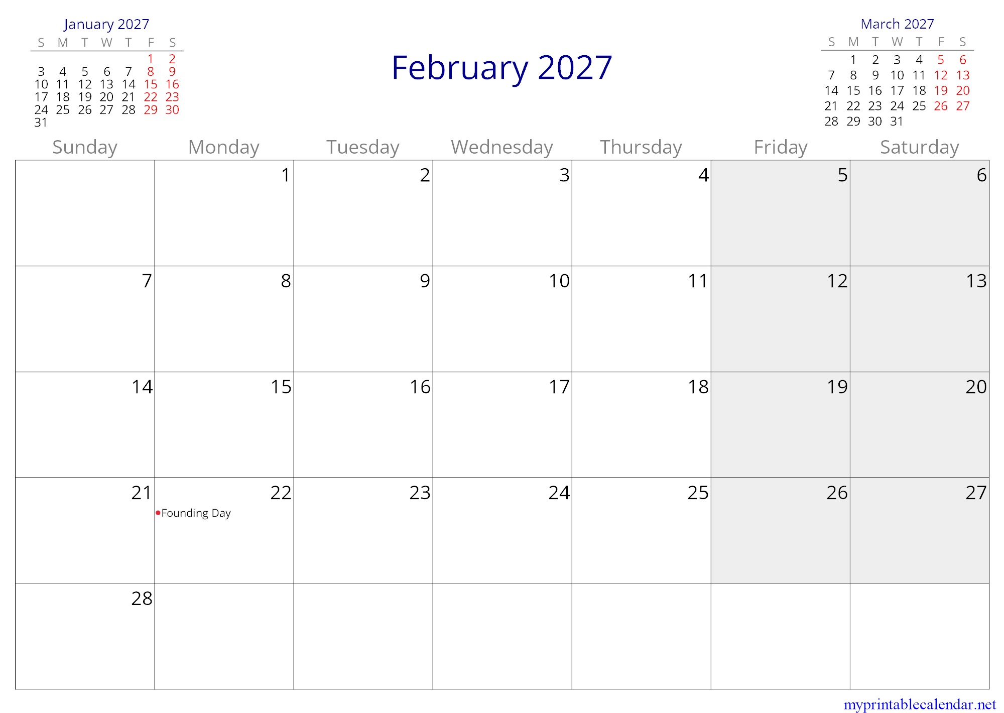 February 2027 monthly calendar, Saudi Arabia, in English jpg