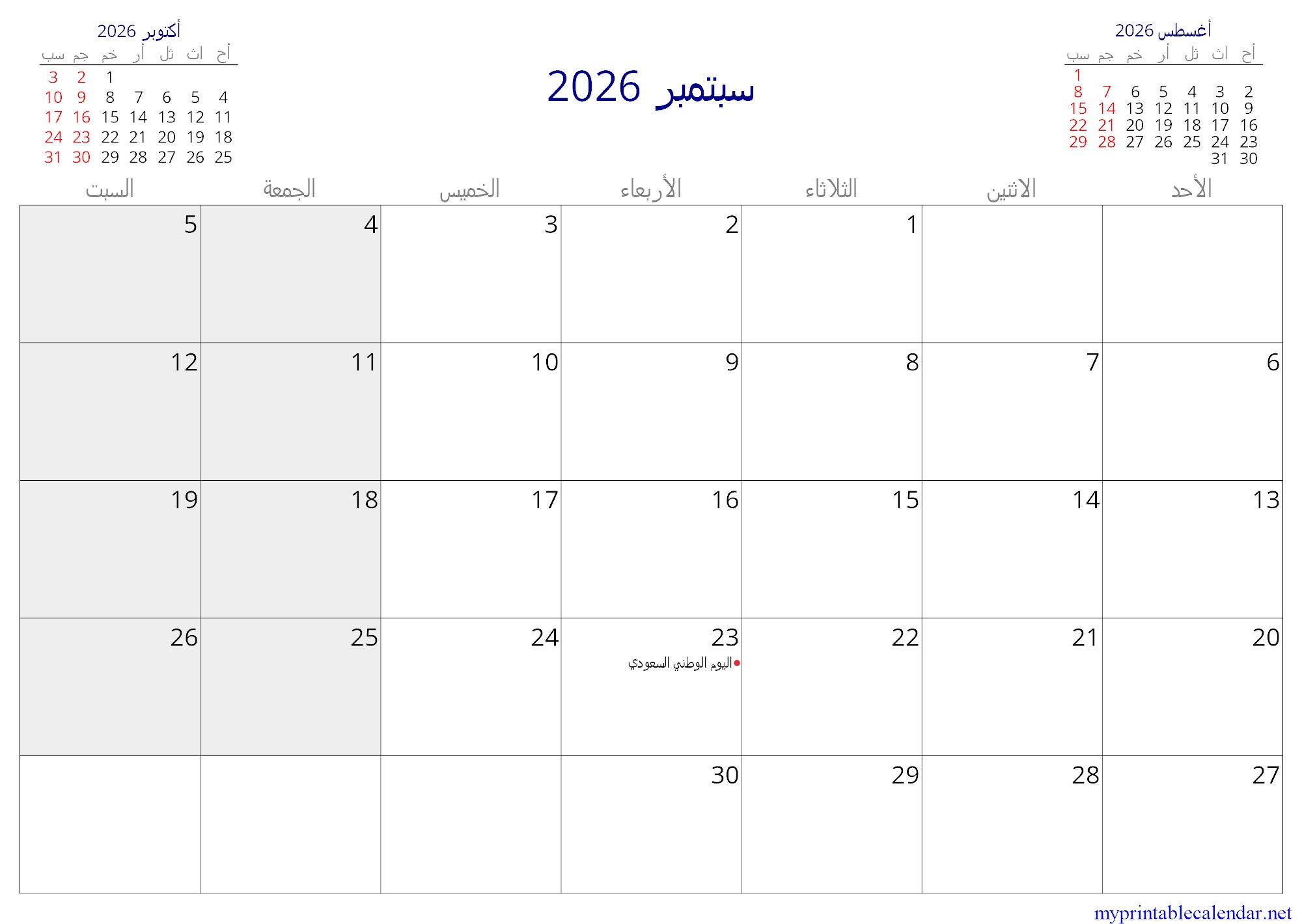 سبتمبر 2026 monthly calendar, Saudi Arabia, Arabic jpg