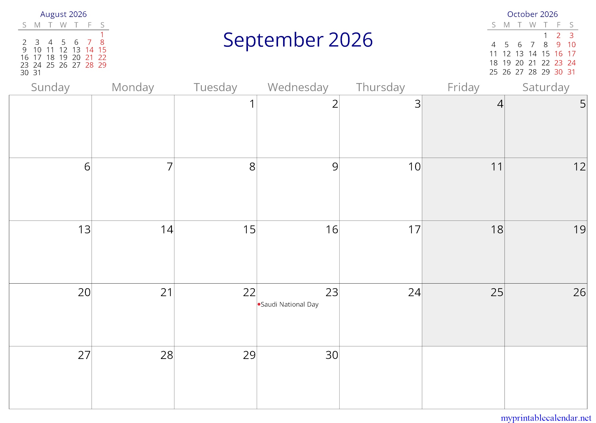 September 2026 monthly calendar, Saudi Arabia, in English jpg