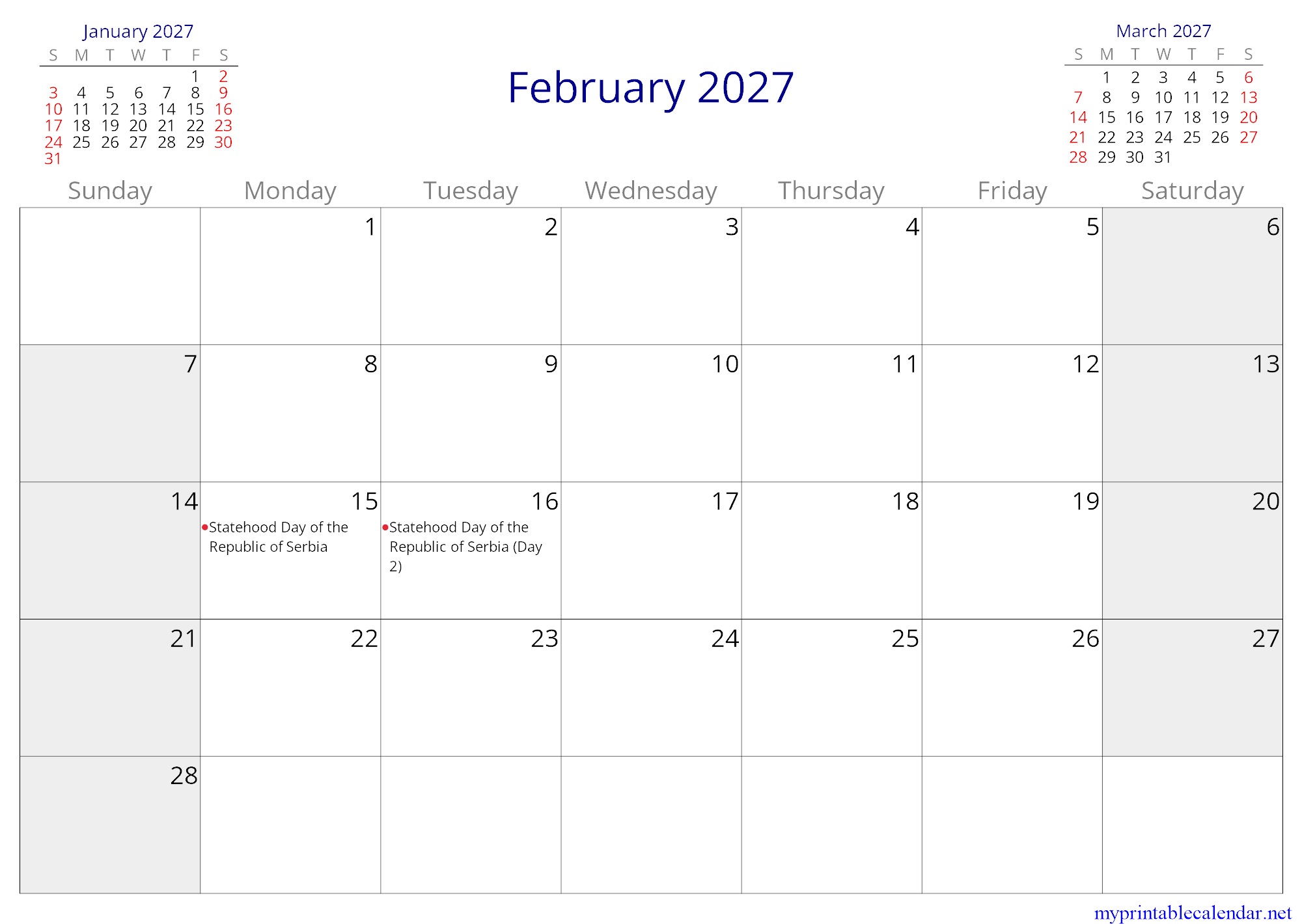 February 2027 monthly calendar, Serbia, in English jpg