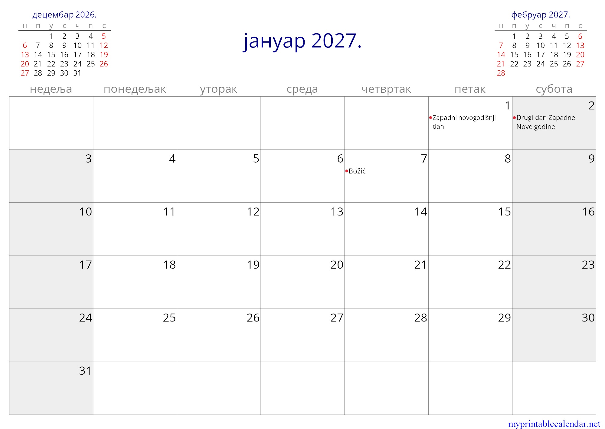 јануар 2027. monthly calendar, Serbia, Serbian jpg