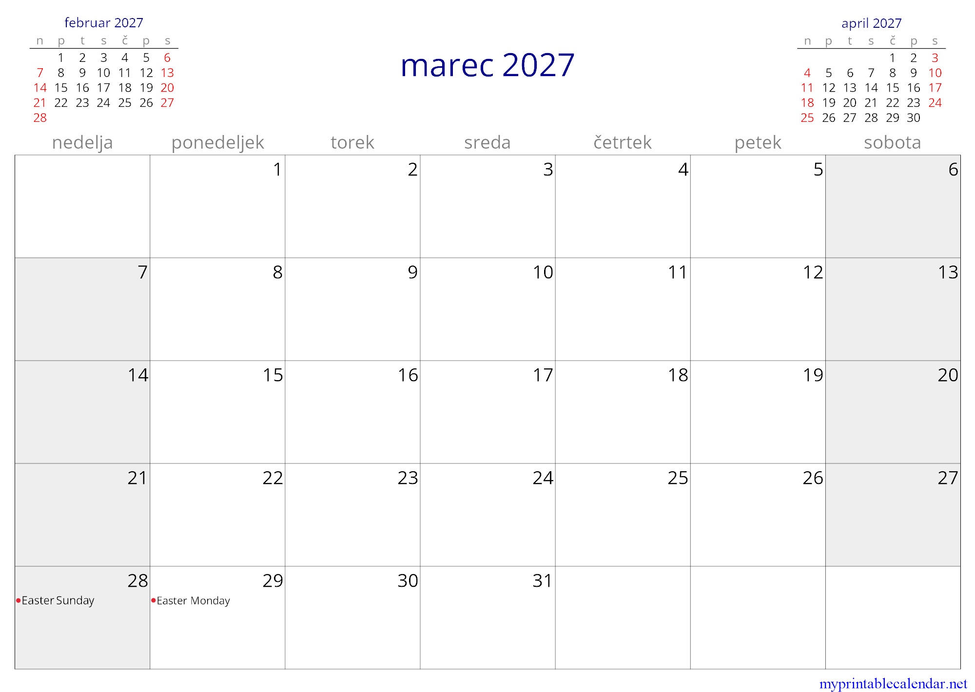 marec 2027 monthly calendar, Slovenia, Slovenian jpg