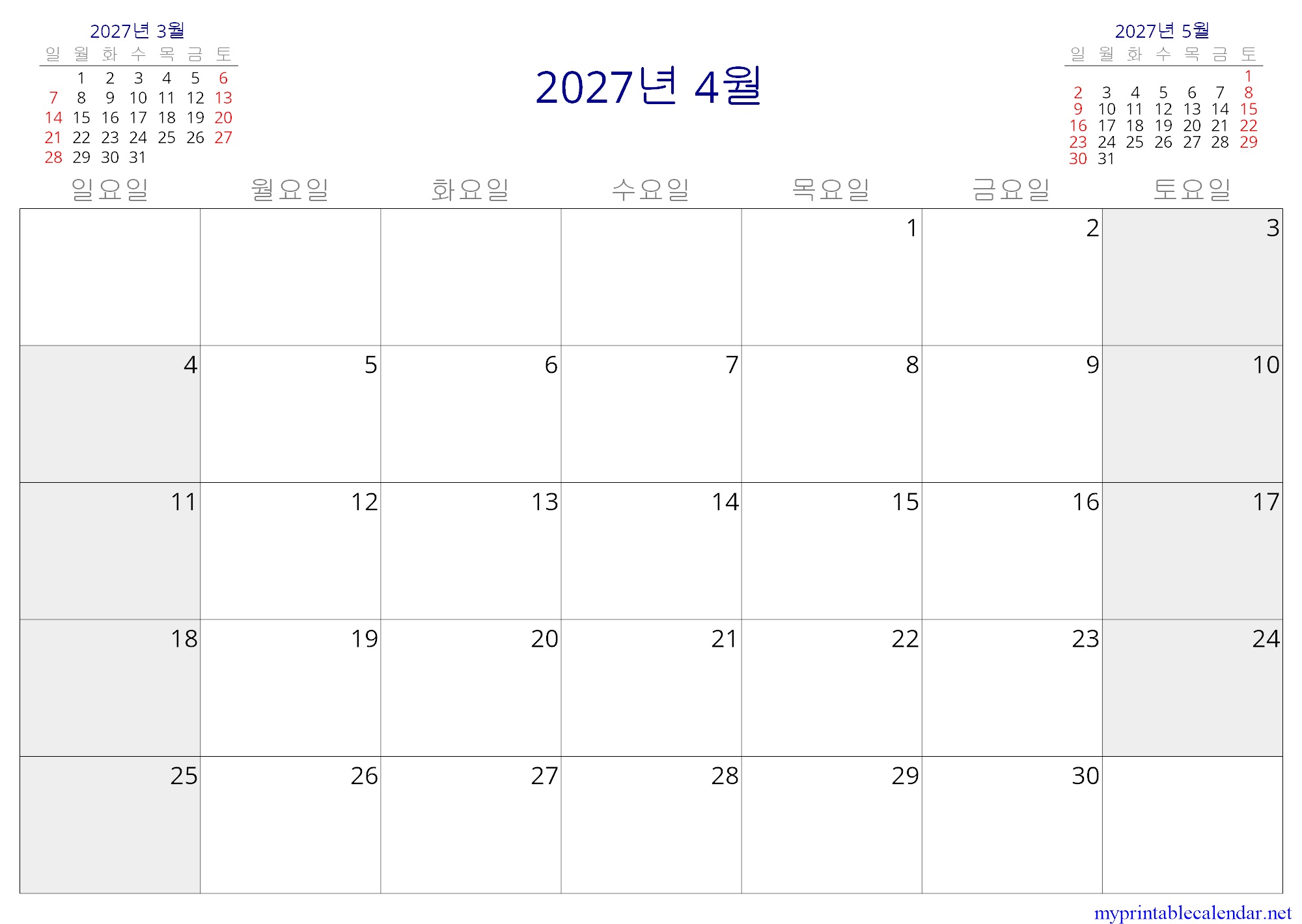 2027년 4월 monthly calendar, South Korea, Korean jpg