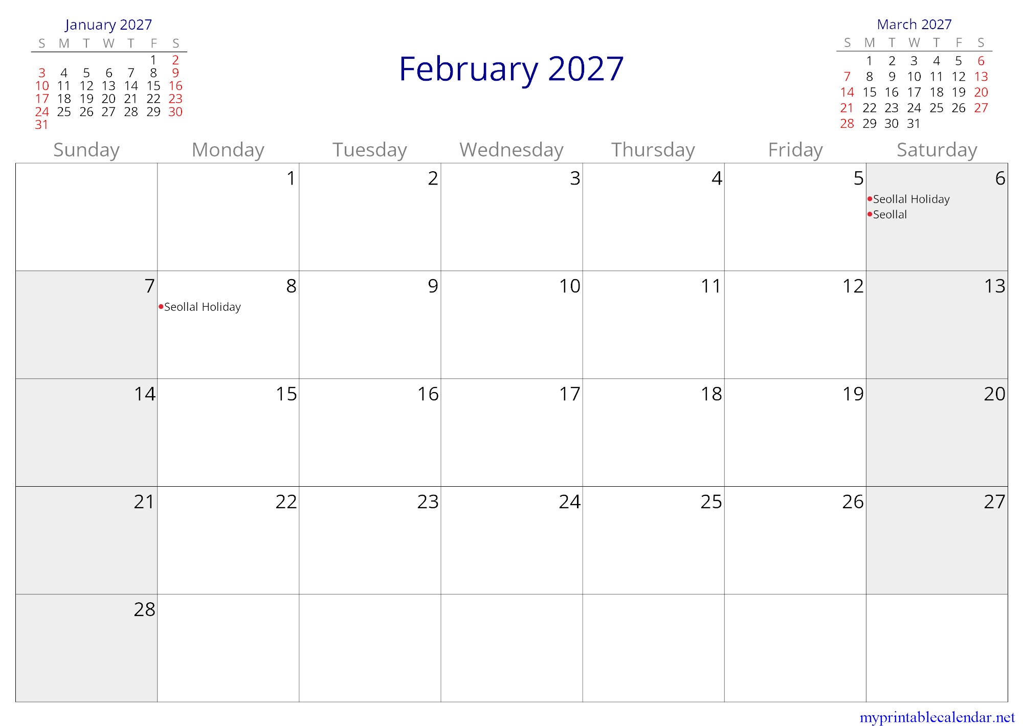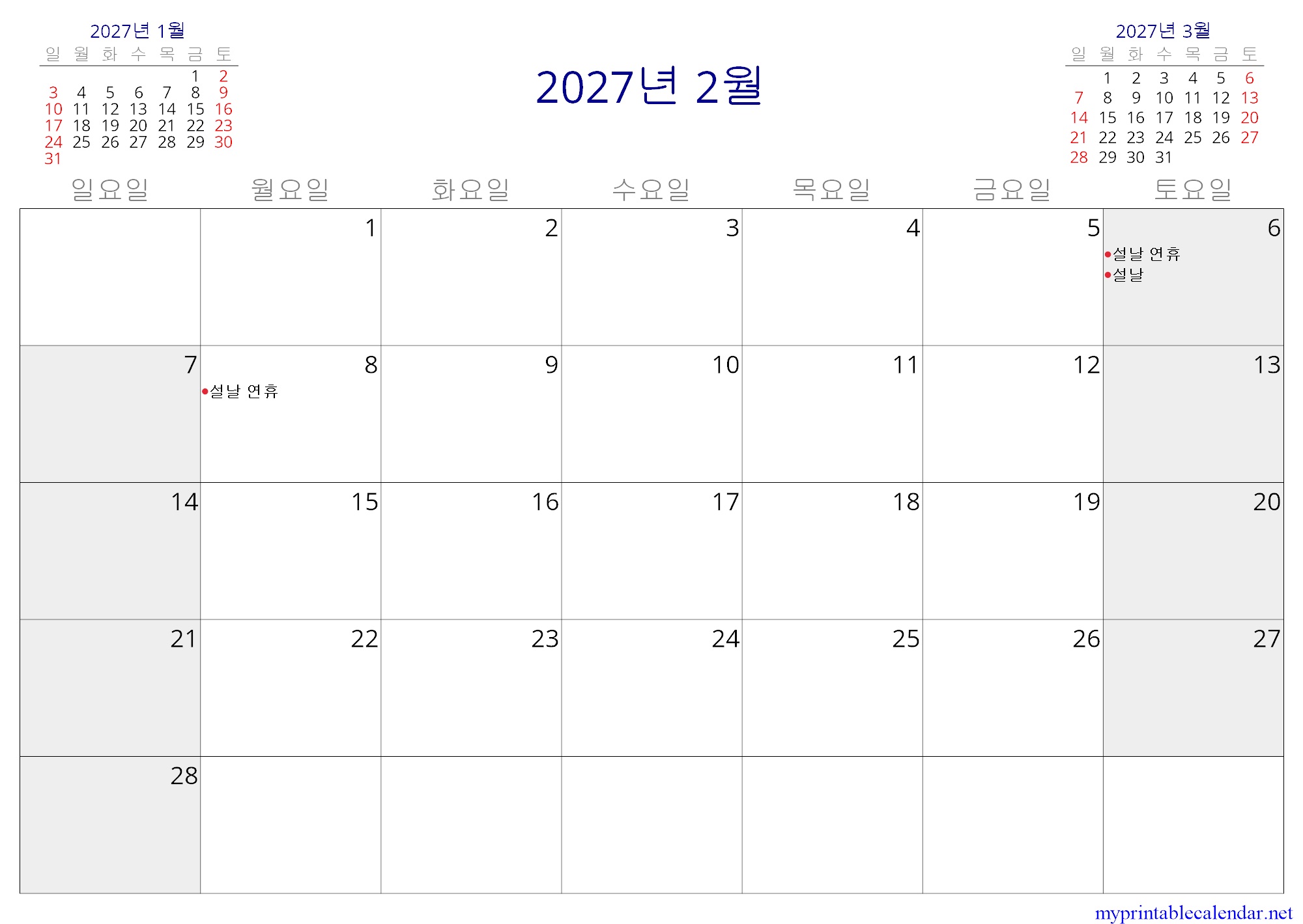 2027년 2월 monthly calendar, South Korea, Korean jpg