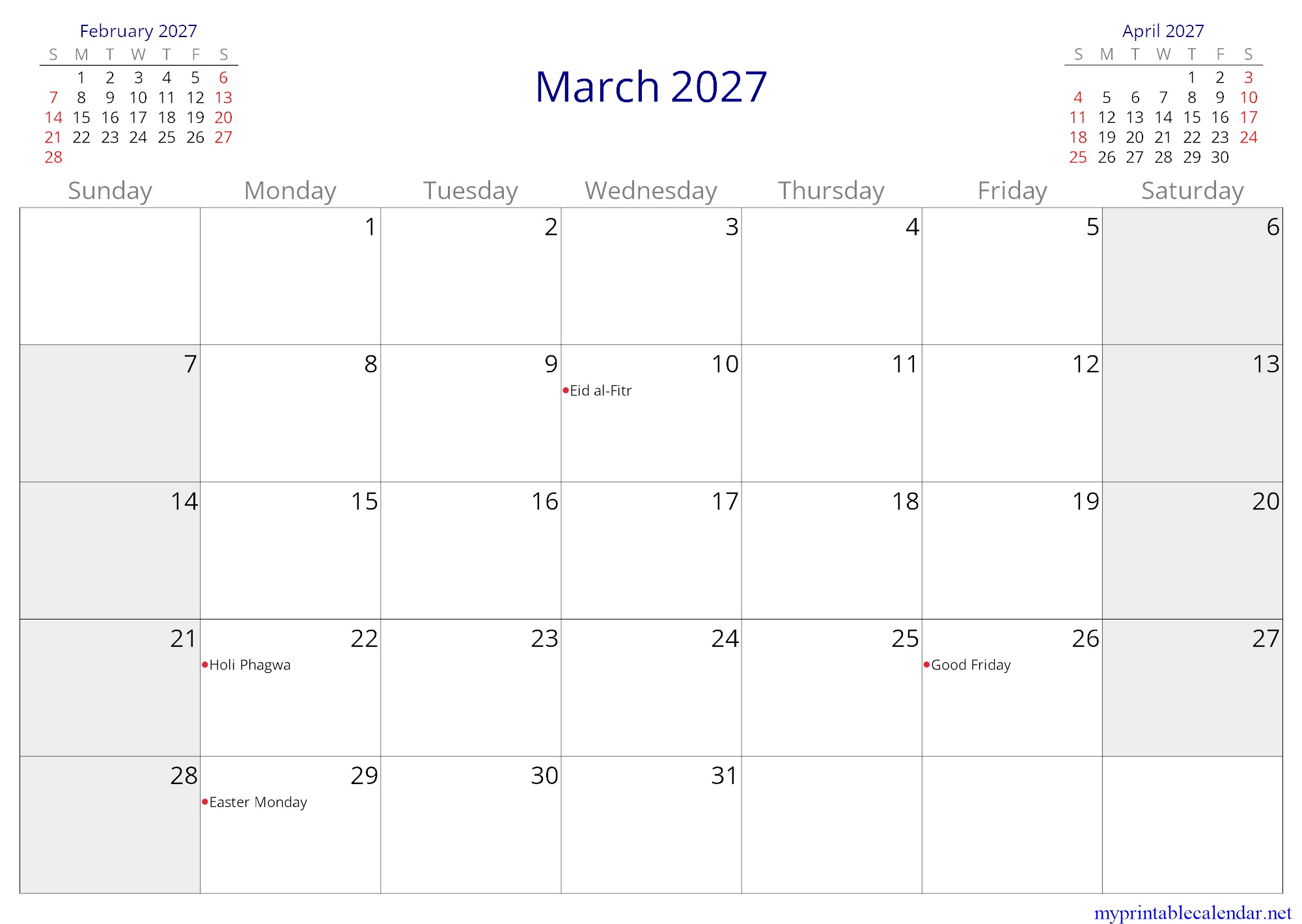 March 2027 monthly calendar, Suriname, in English jpg