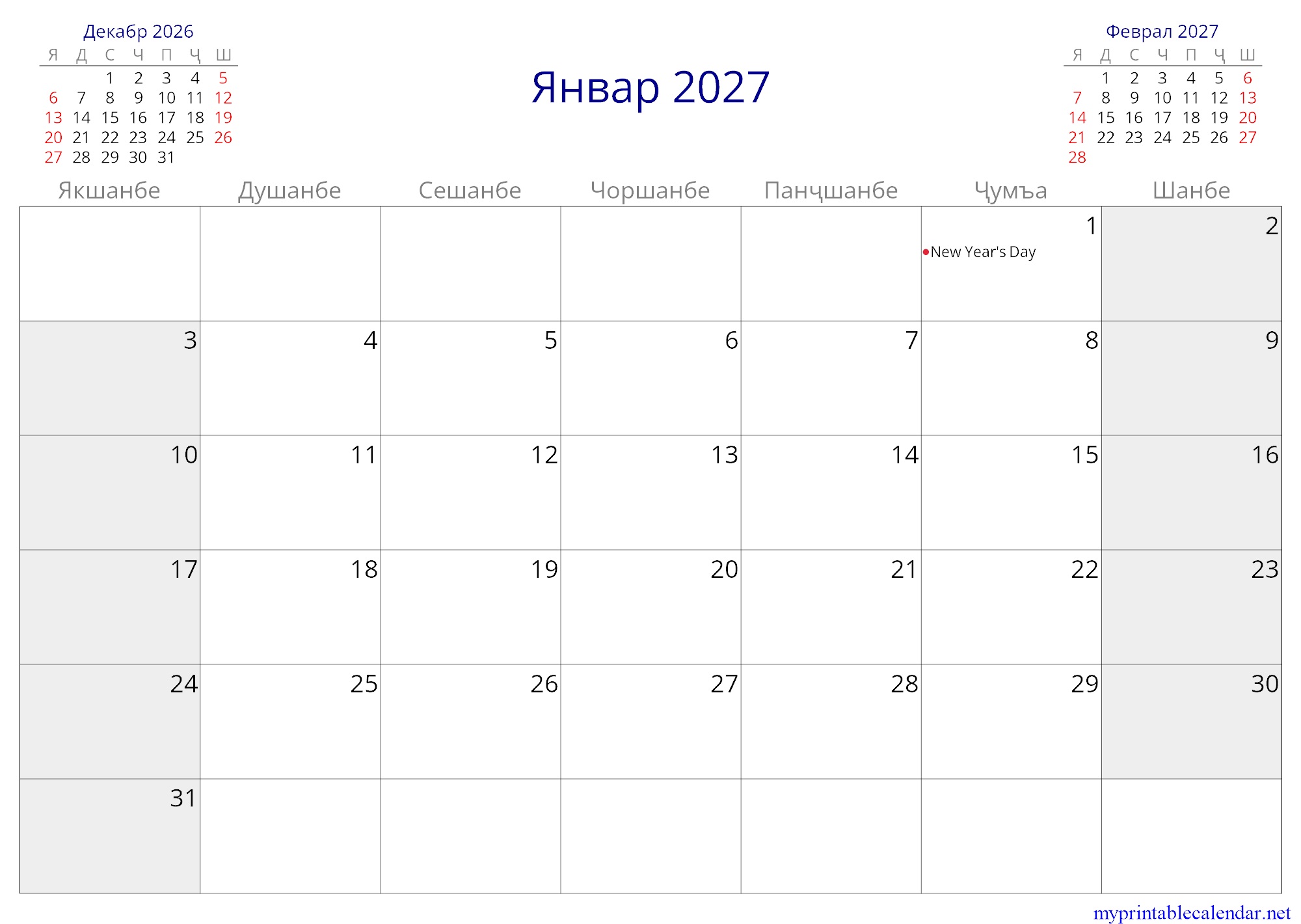 Январ 2027 monthly calendar, Tajikistan, Tajik jpg