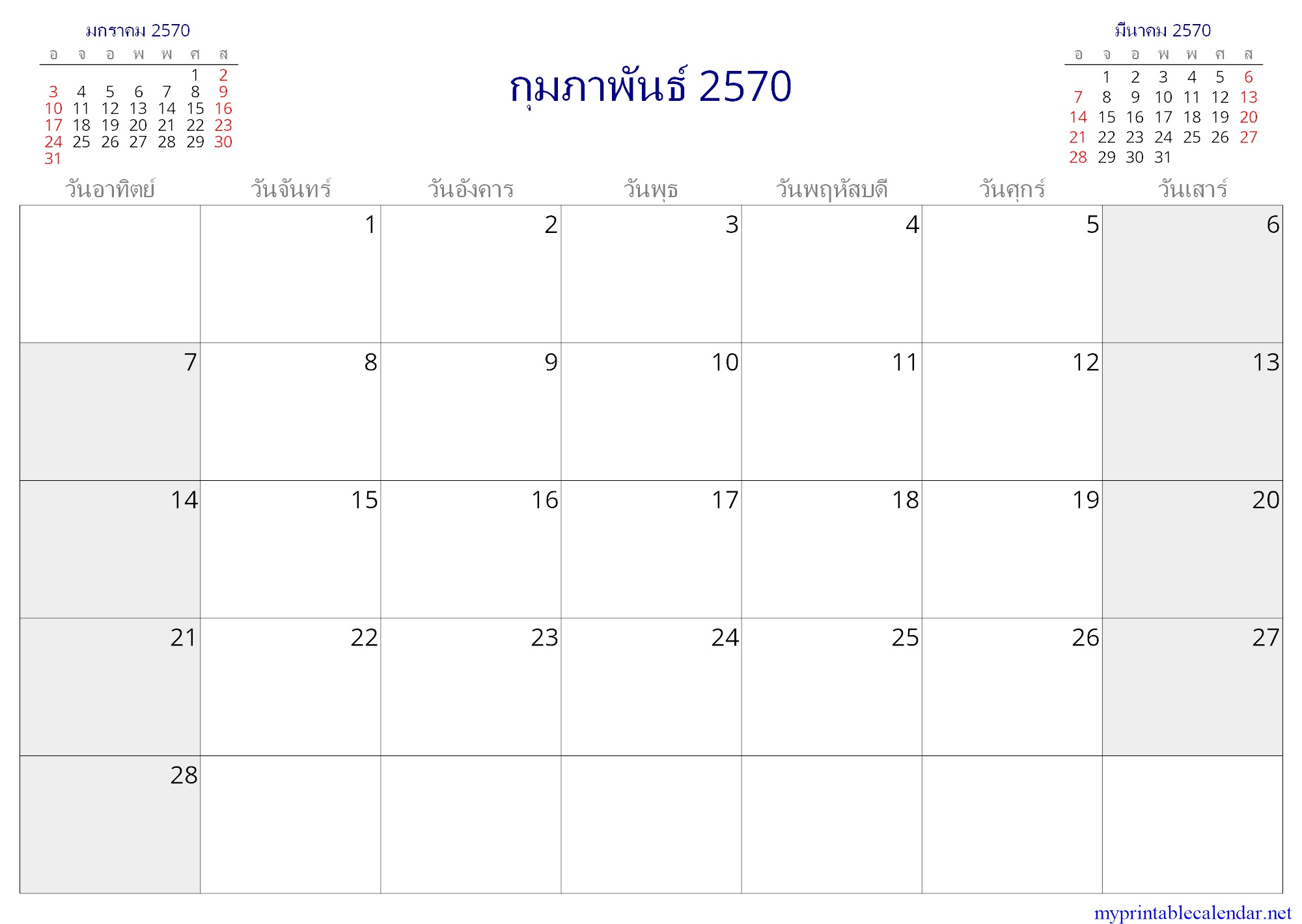 กุมภาพันธ์ 2570 monthly calendar, Thailand, Thai jpg