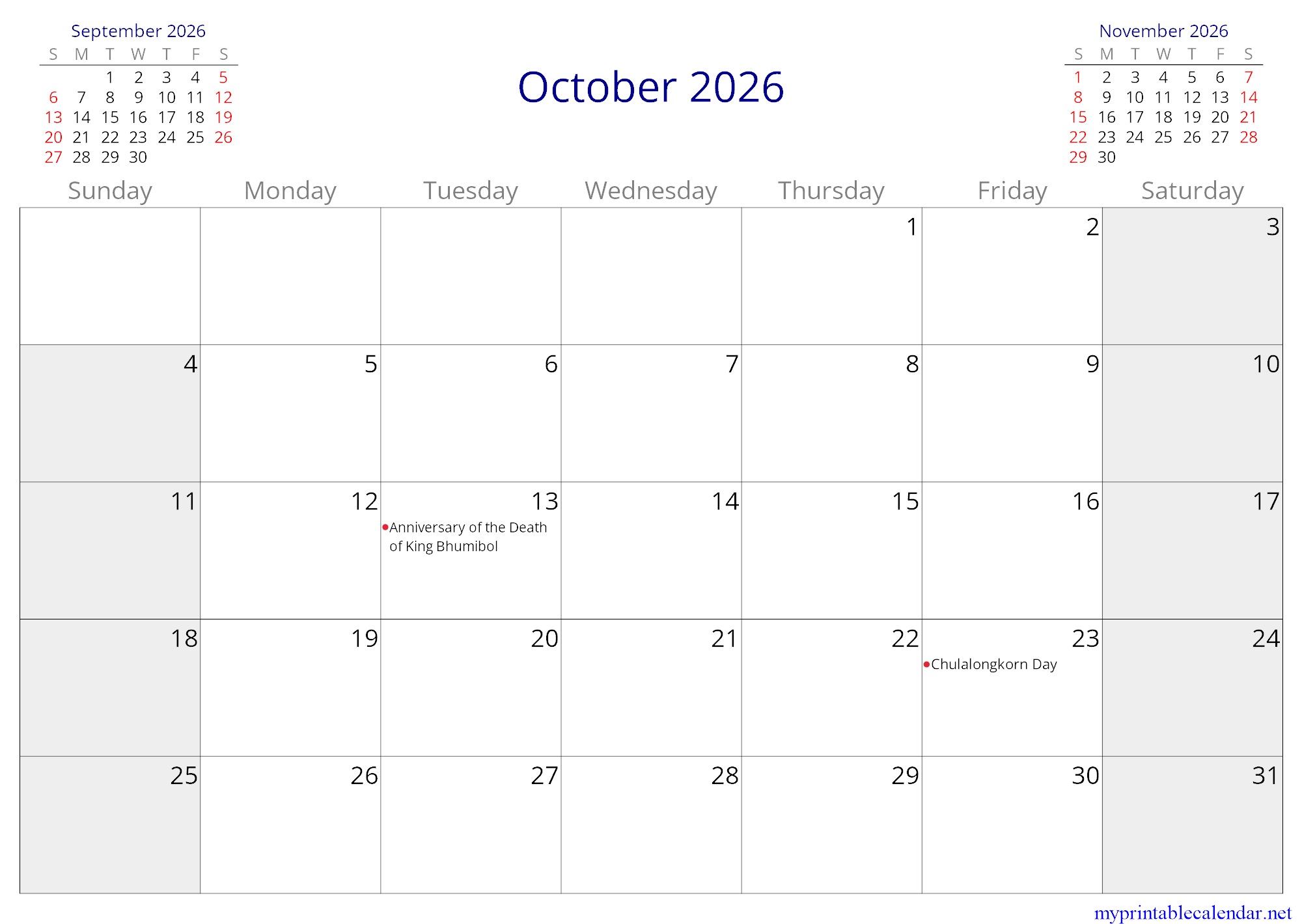 October 2026 monthly calendar, Thailand, in English jpg