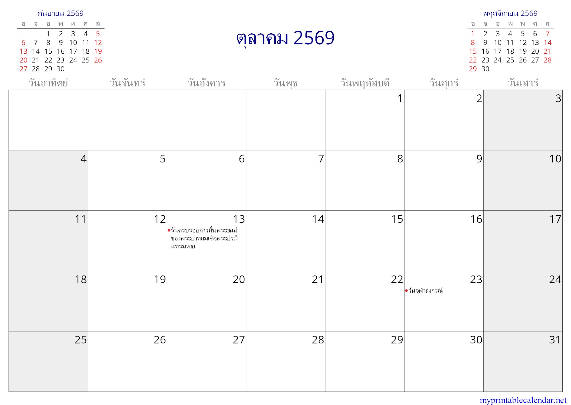 ตุลาคม 2569 monthly calendar, Thailand, Thai jpg