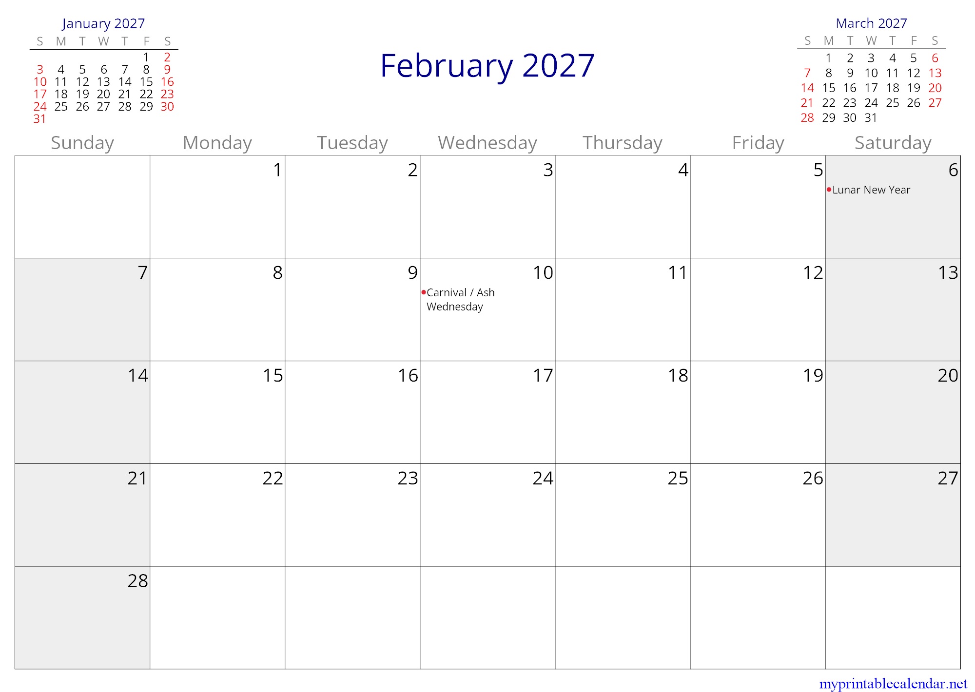 February 2027 monthly calendar, Timor-Leste, in English jpg
