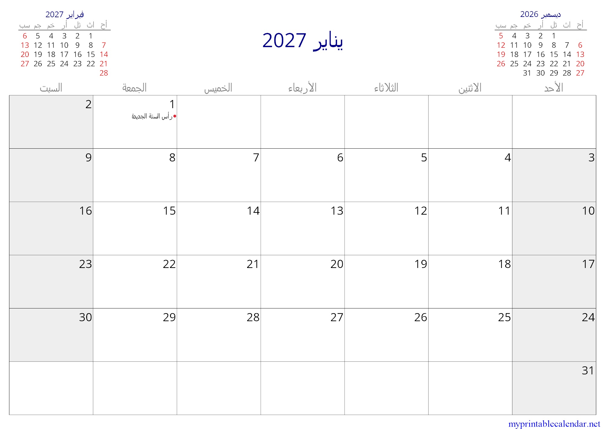 يناير 2027 monthly calendar, Tunisia, Arabic jpg