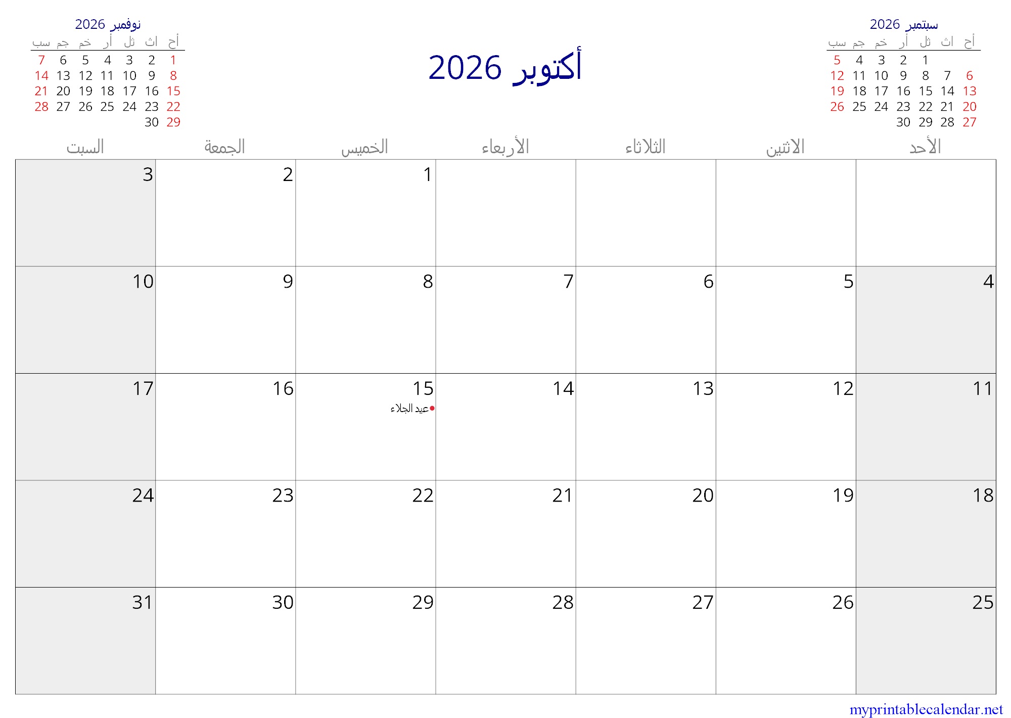 أكتوبر 2026 monthly calendar, Tunisia, Arabic jpg