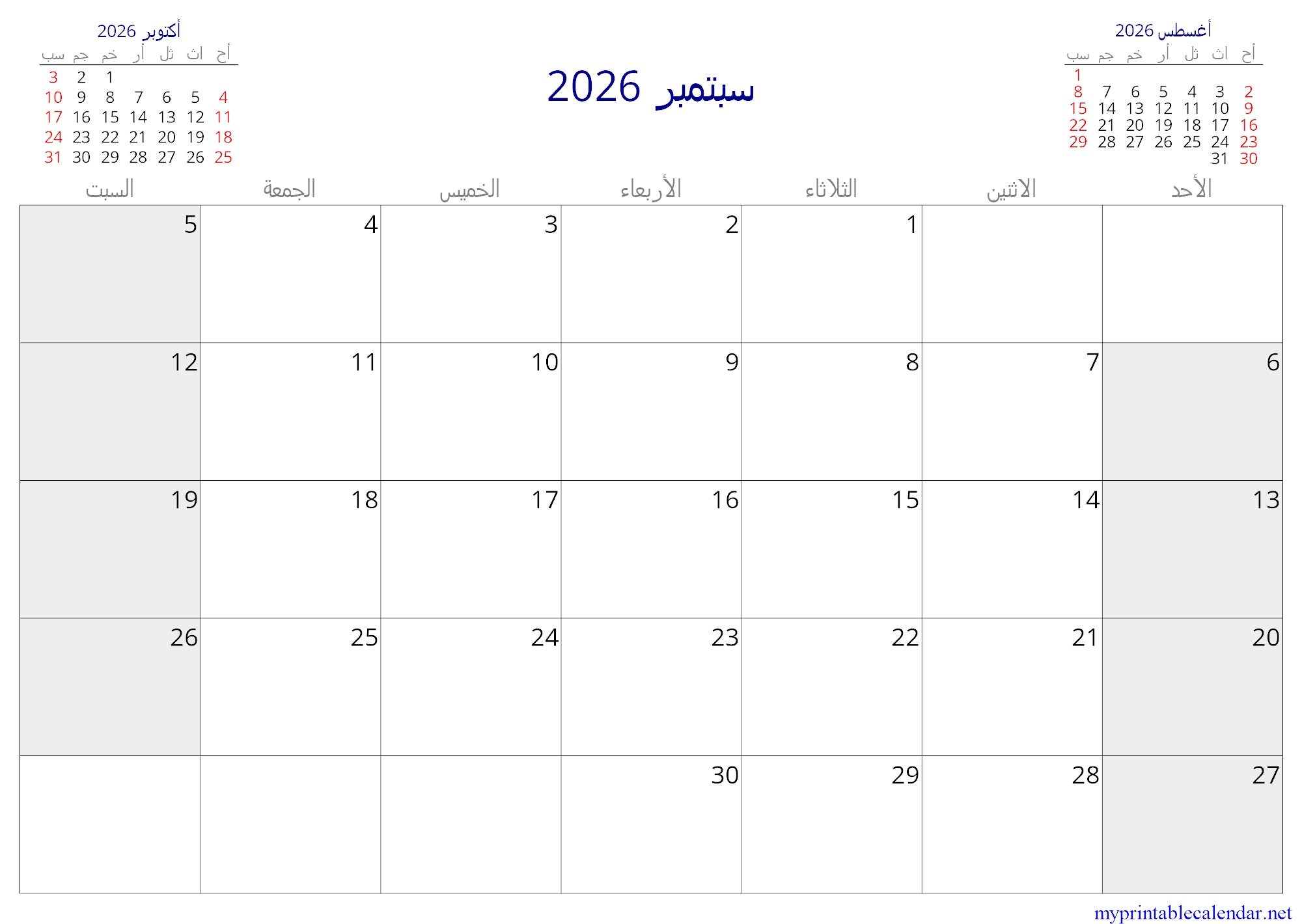 سبتمبر 2026 monthly calendar, Tunisia, Arabic jpg