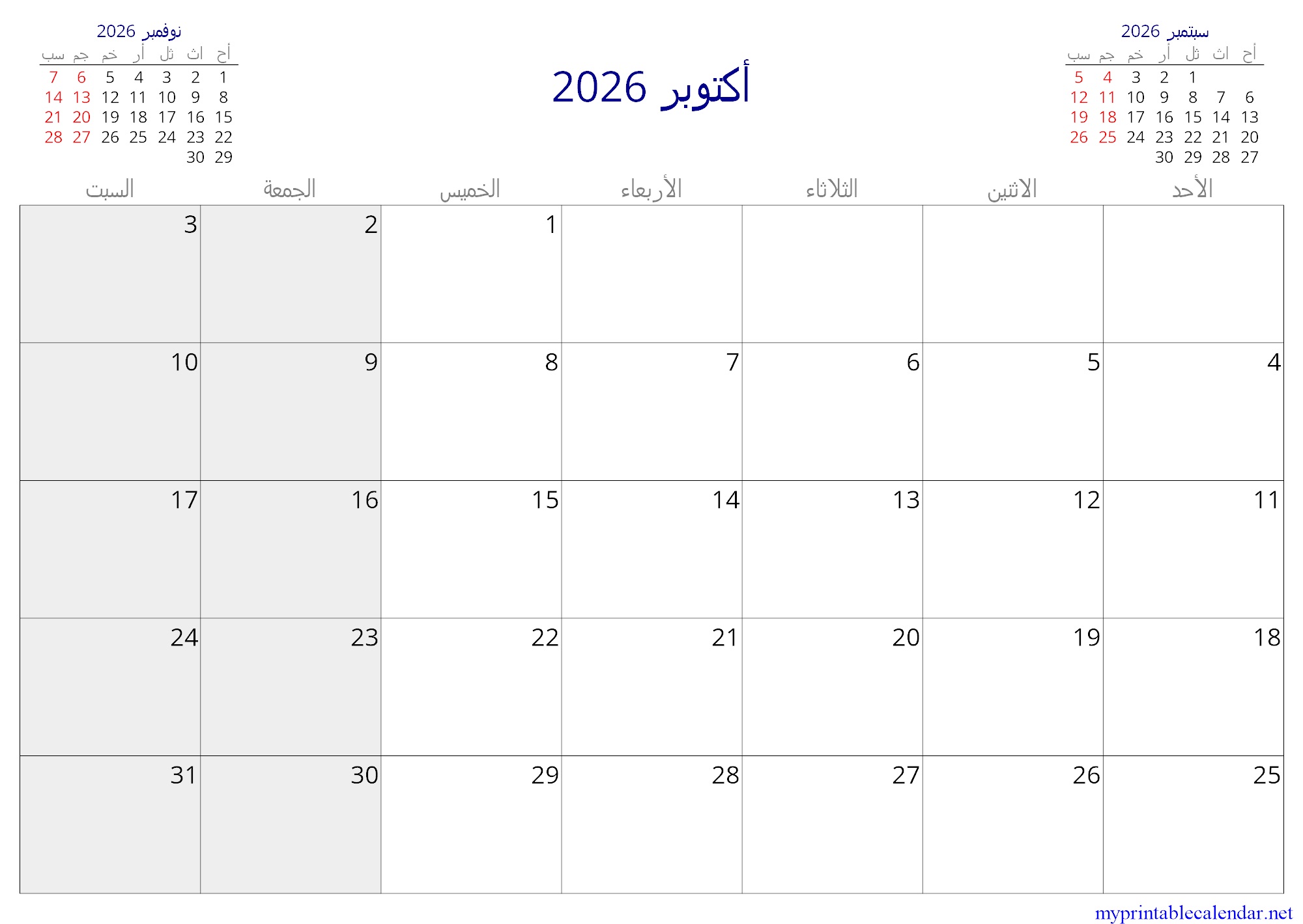 أكتوبر 2026 monthly calendar, United Arab Emirates, Arabic jpg
