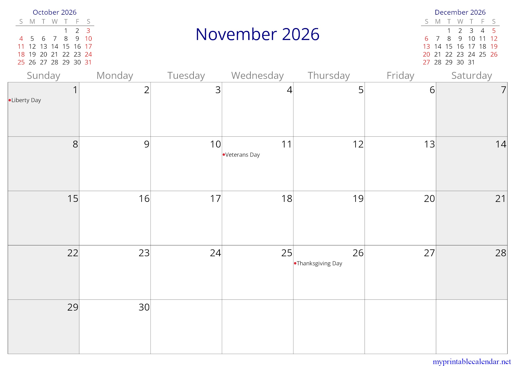 November 2026 monthly calendar, United States Virgin Islands, English jpg