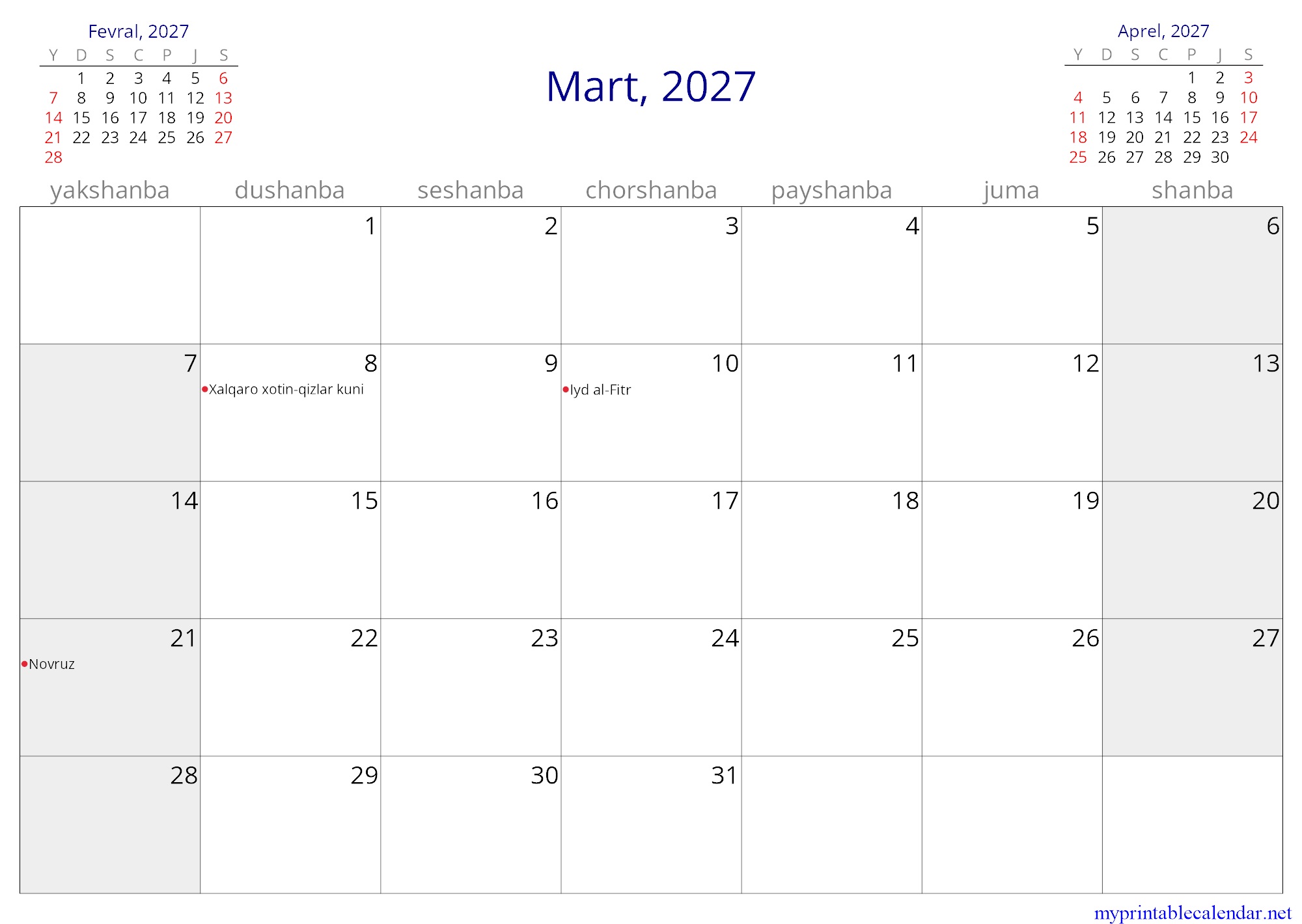 Mart, 2027 monthly calendar, Uzbekistan, Uzbek (Latin, Uzbekistan) jpg