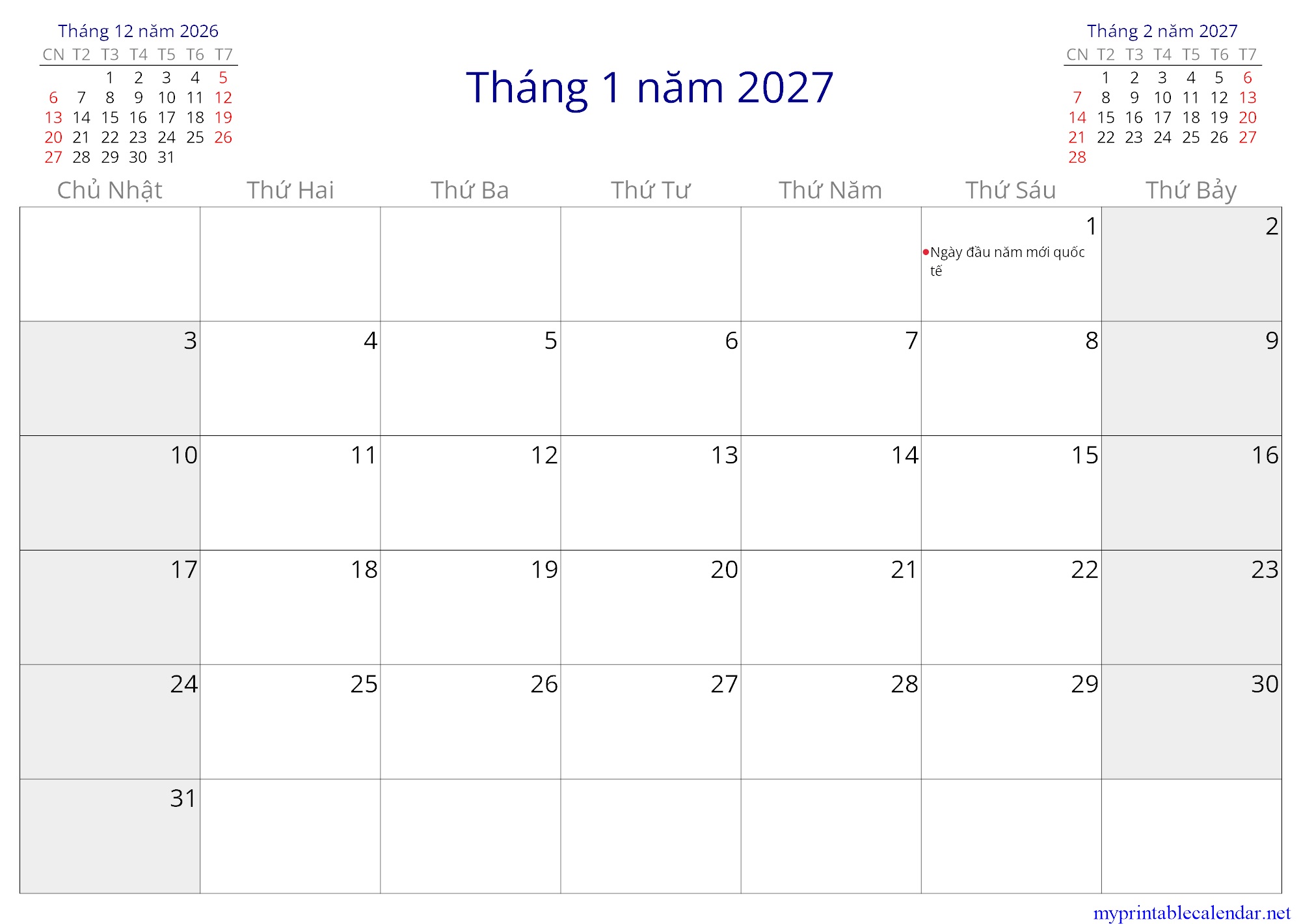 Tháng 1 năm 2027 monthly calendar, Vietnam, Vietnamese jpg