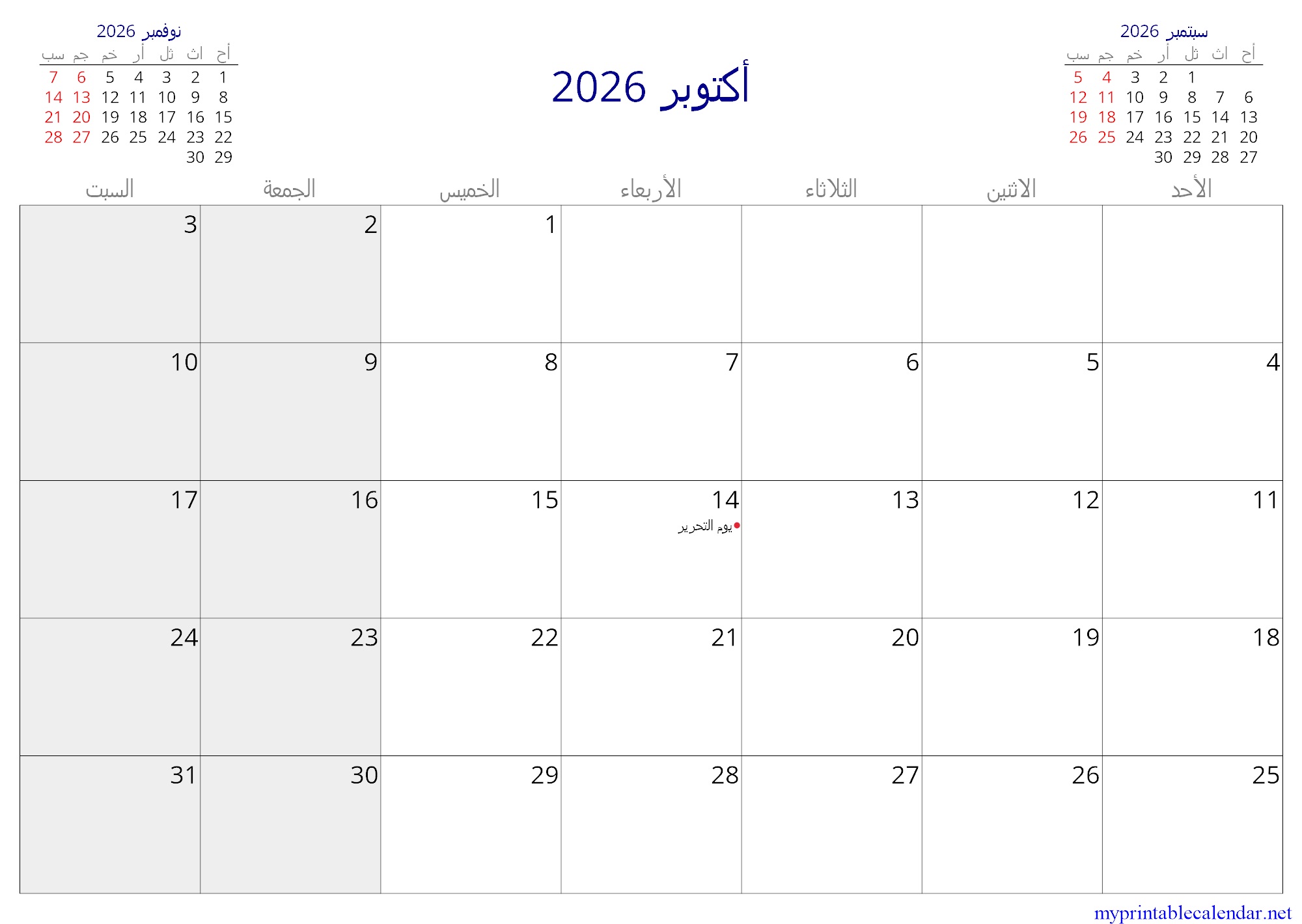 أكتوبر 2026 monthly calendar, Yemen, Arabic jpg