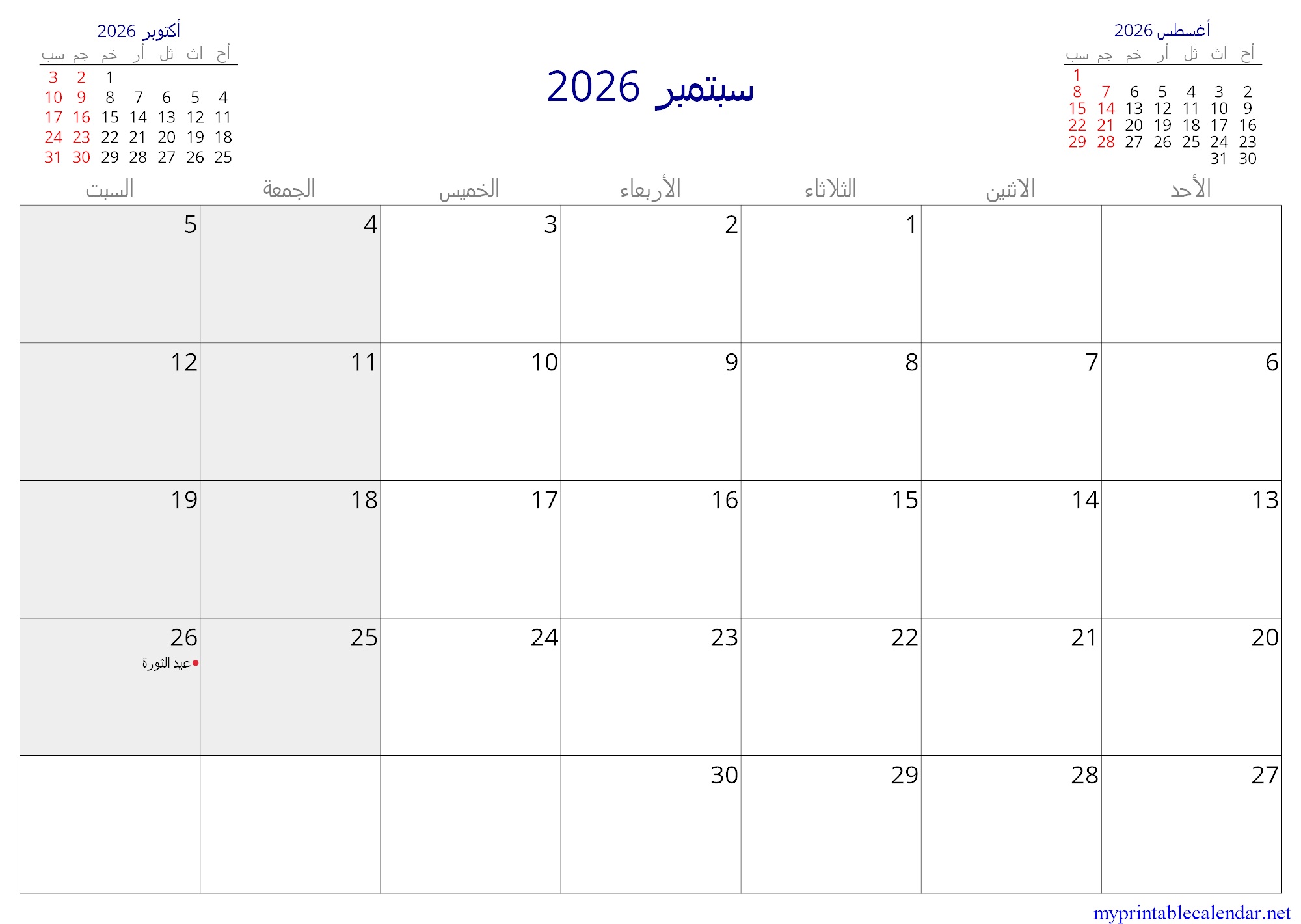 سبتمبر 2026 monthly calendar, Yemen, Arabic jpg