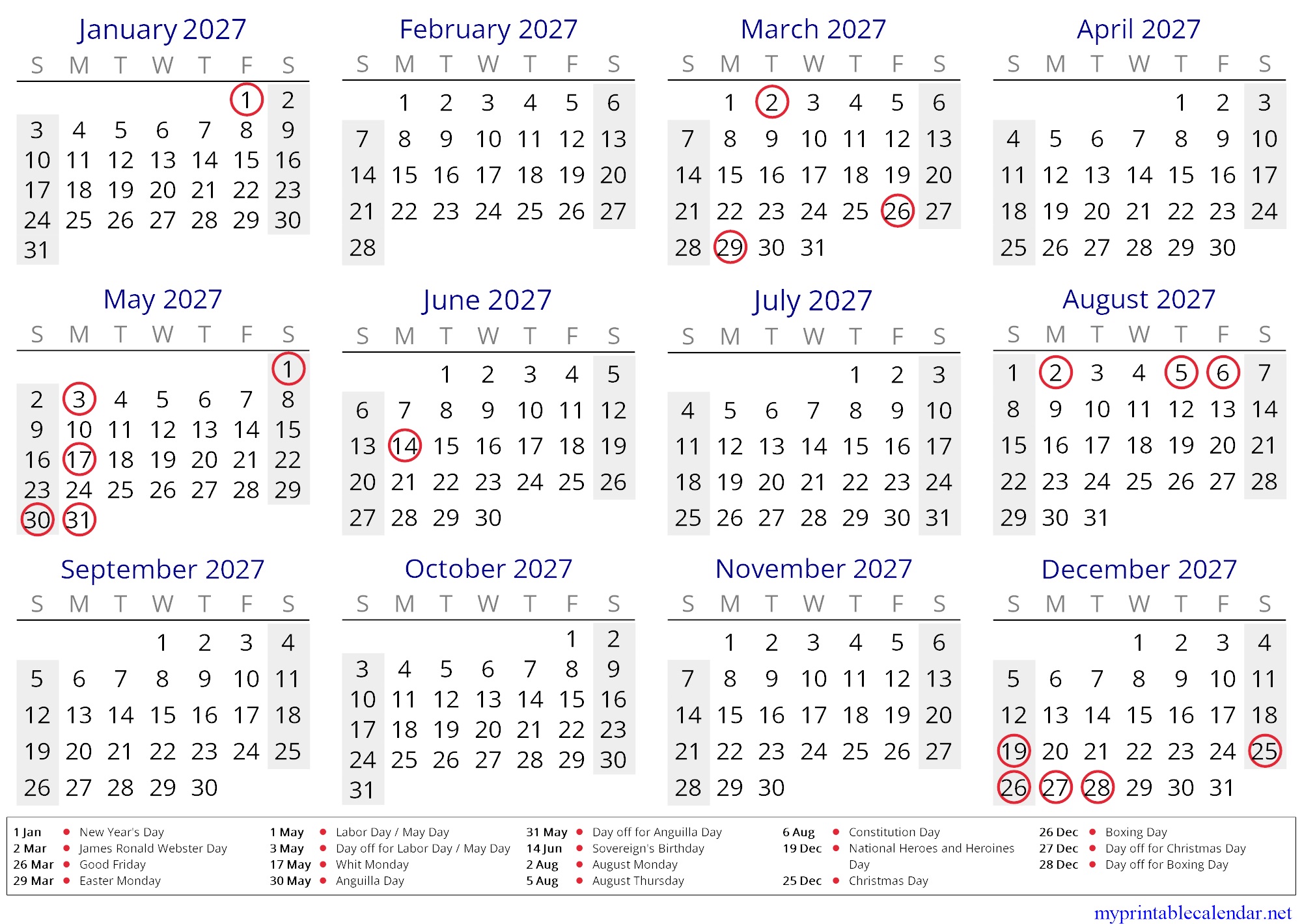 Yearly calendar for 2027, Anguilla, English jpg