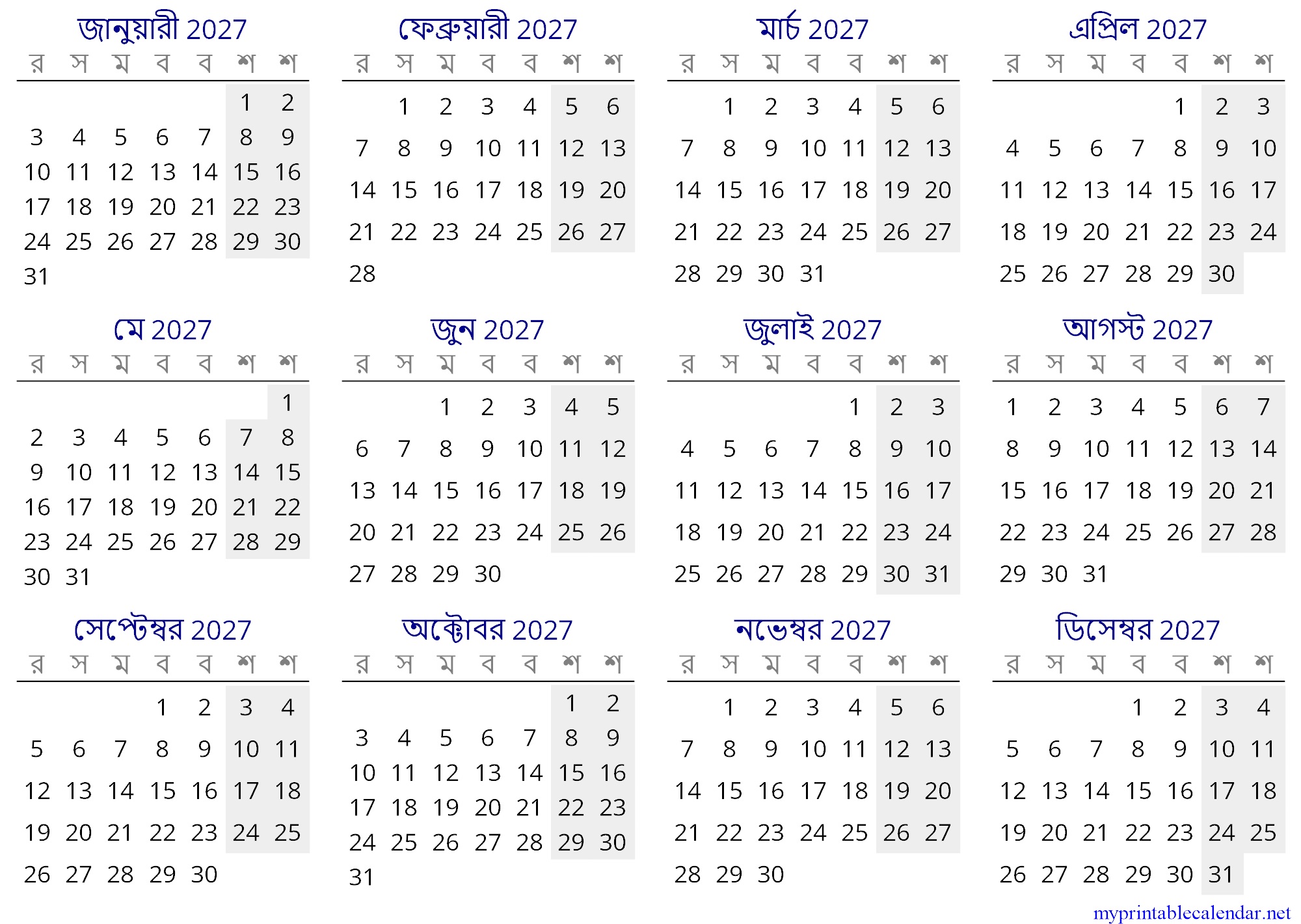 Yearly calendar for 2027, Bangladesh, Bengali jpg