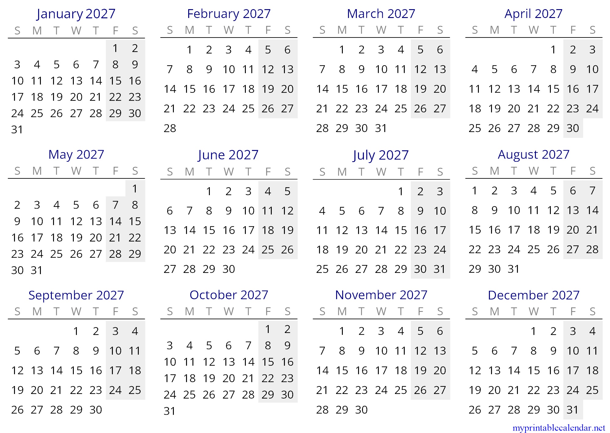 Yearly calendar for 2027, Bangladesh, in English jpg