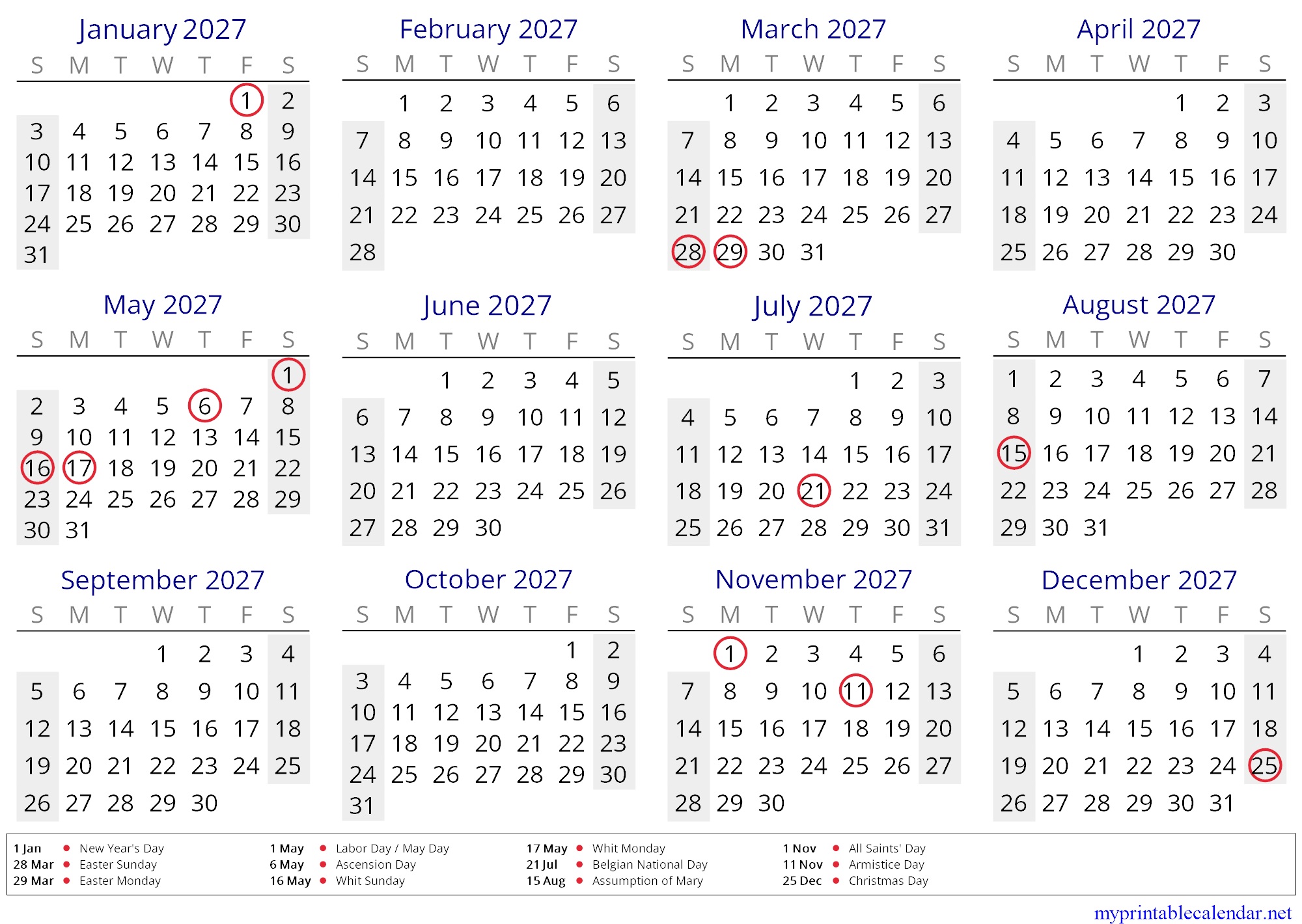 Yearly calendar for 2027, Belgium, English jpg