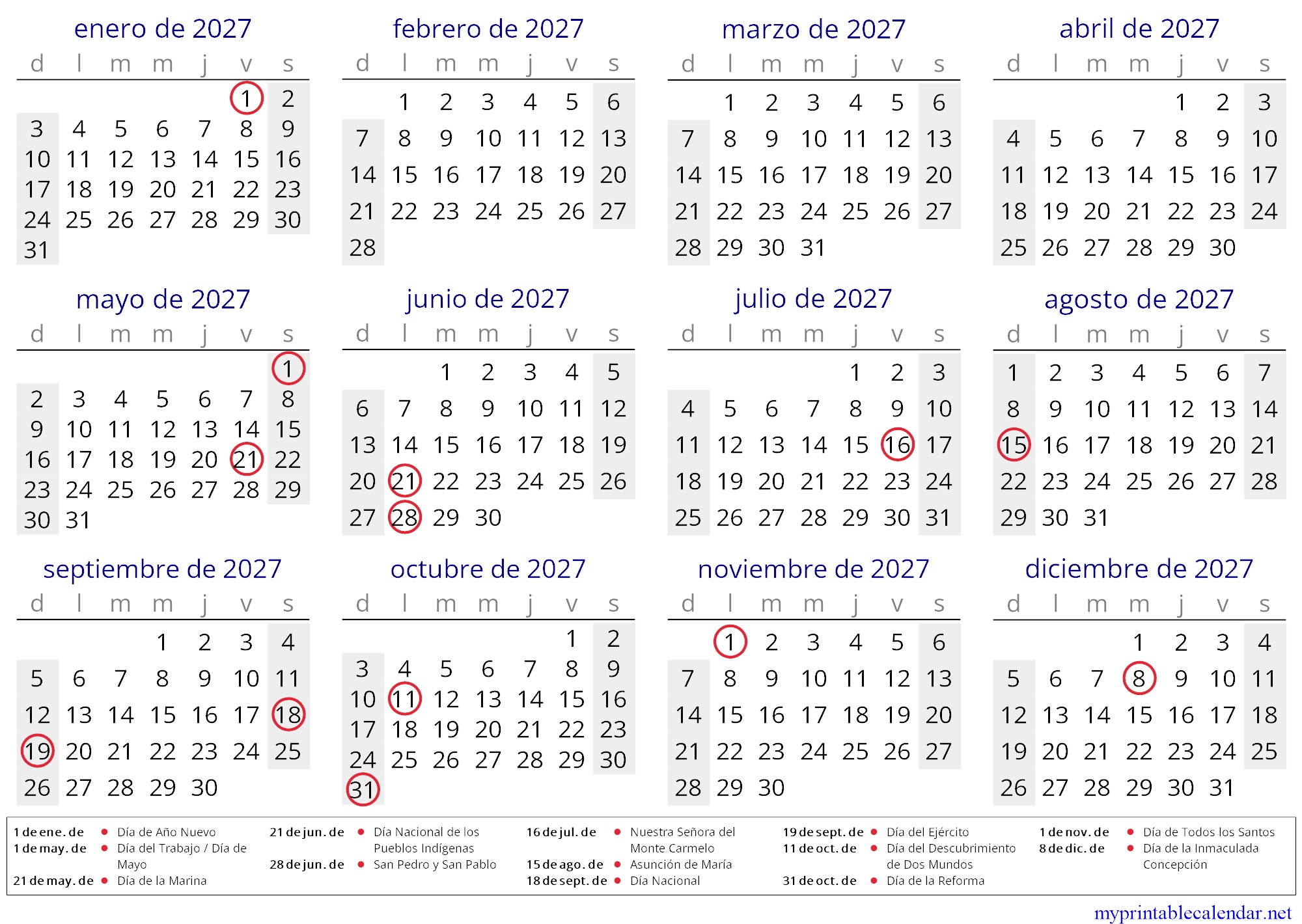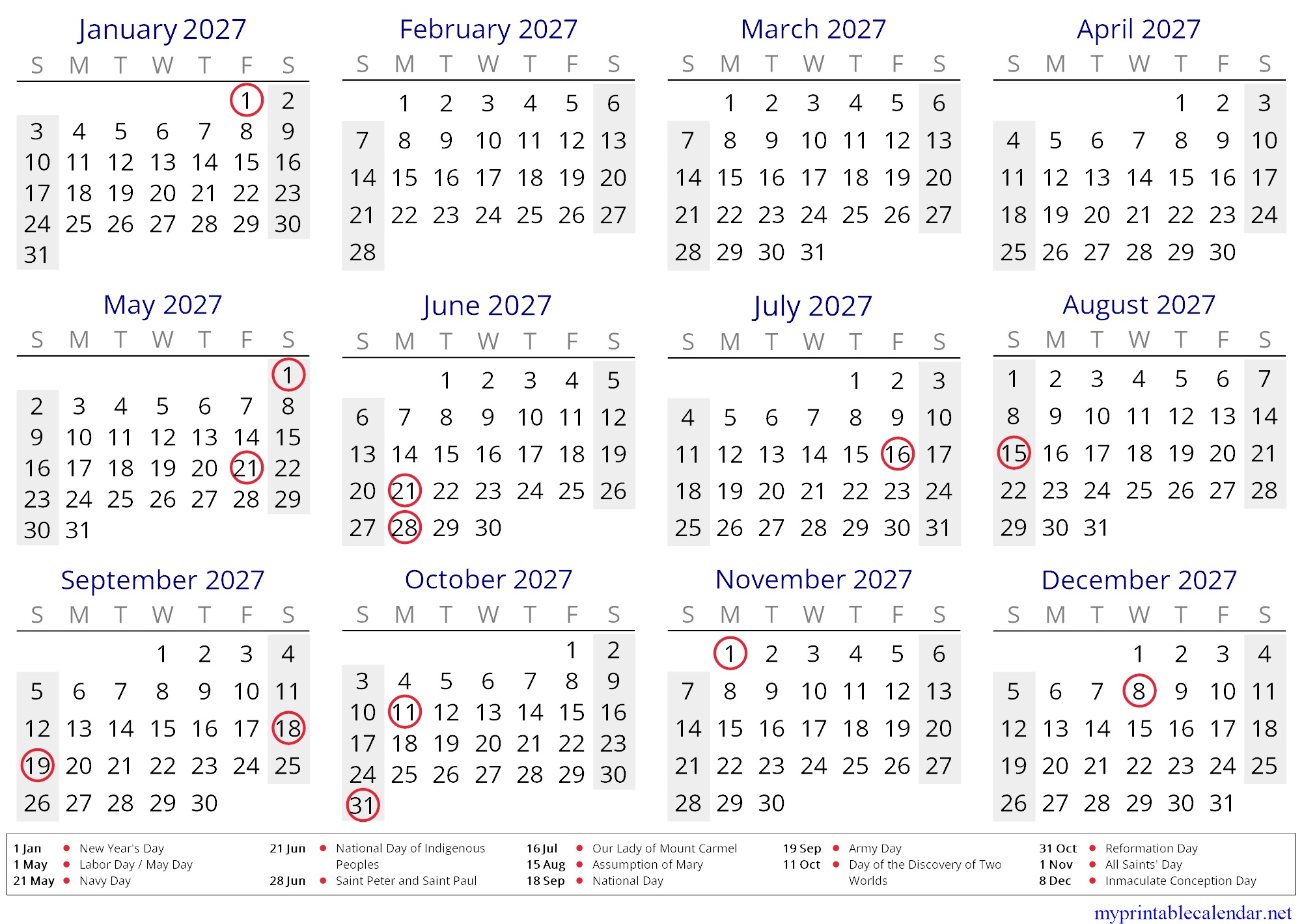 Yearly calendar for 2027, Chile, in English jpg