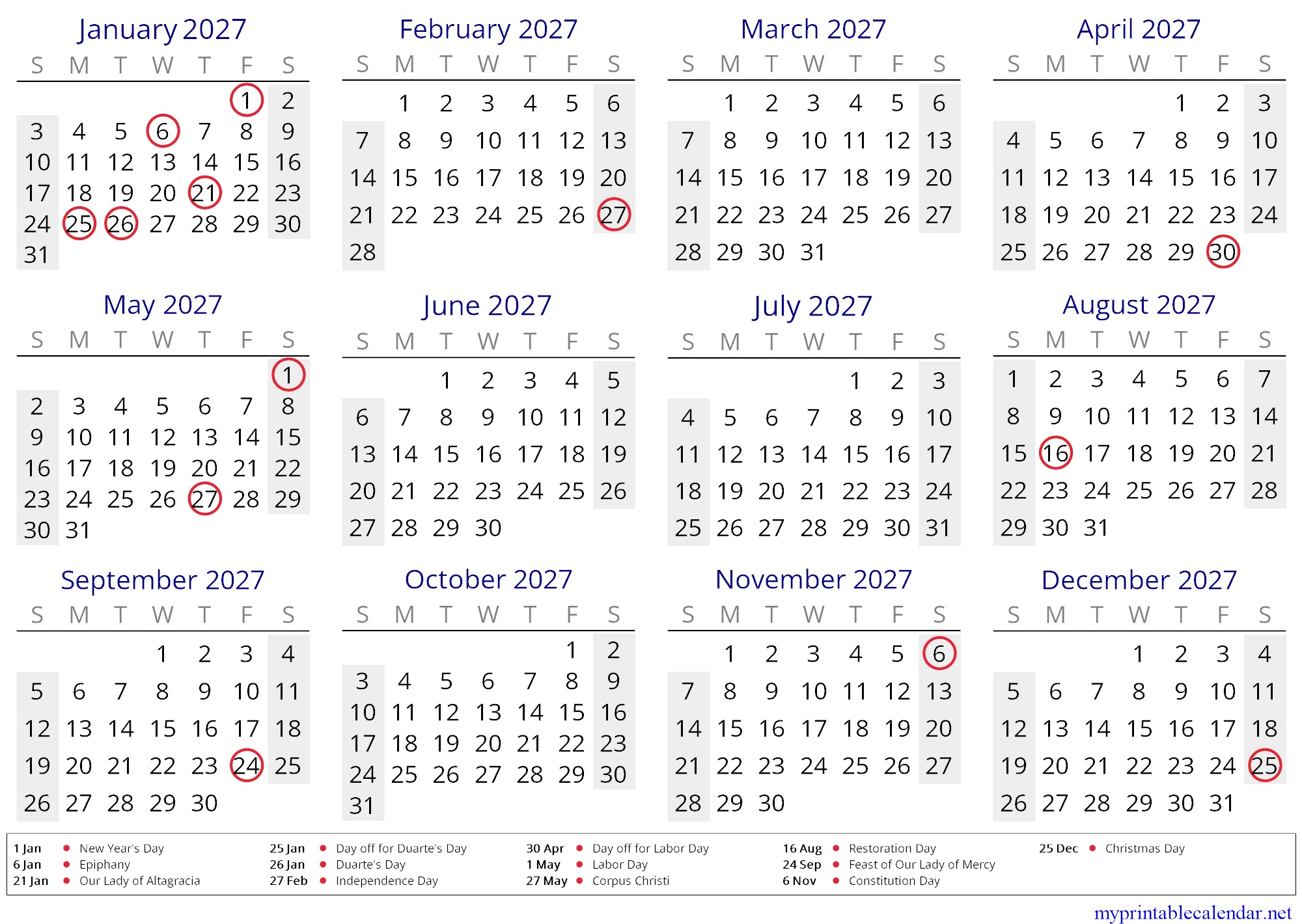 Yearly calendar for 2027, Dominican Republic, in English jpg