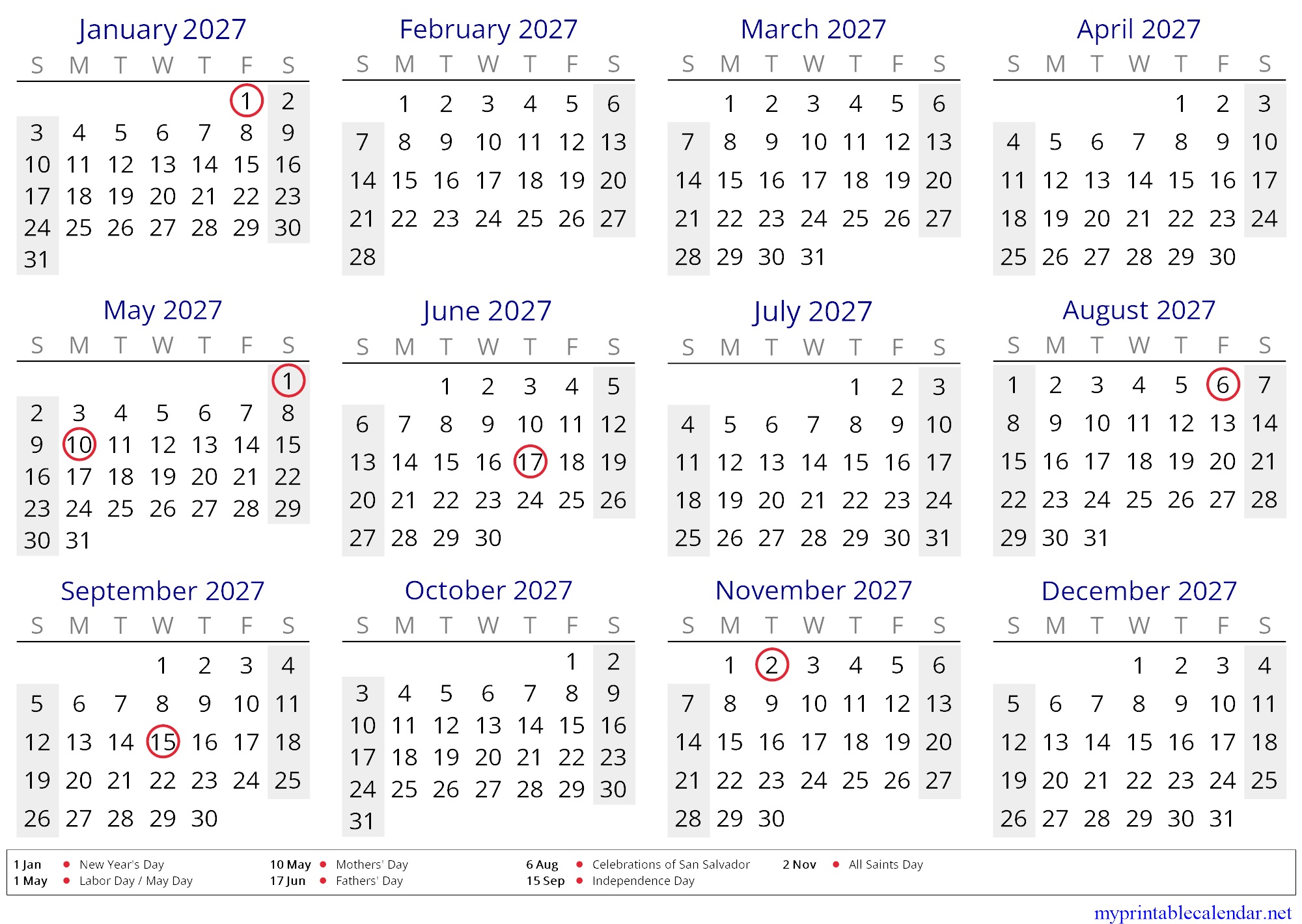 Yearly printable calendar for El Salvador.