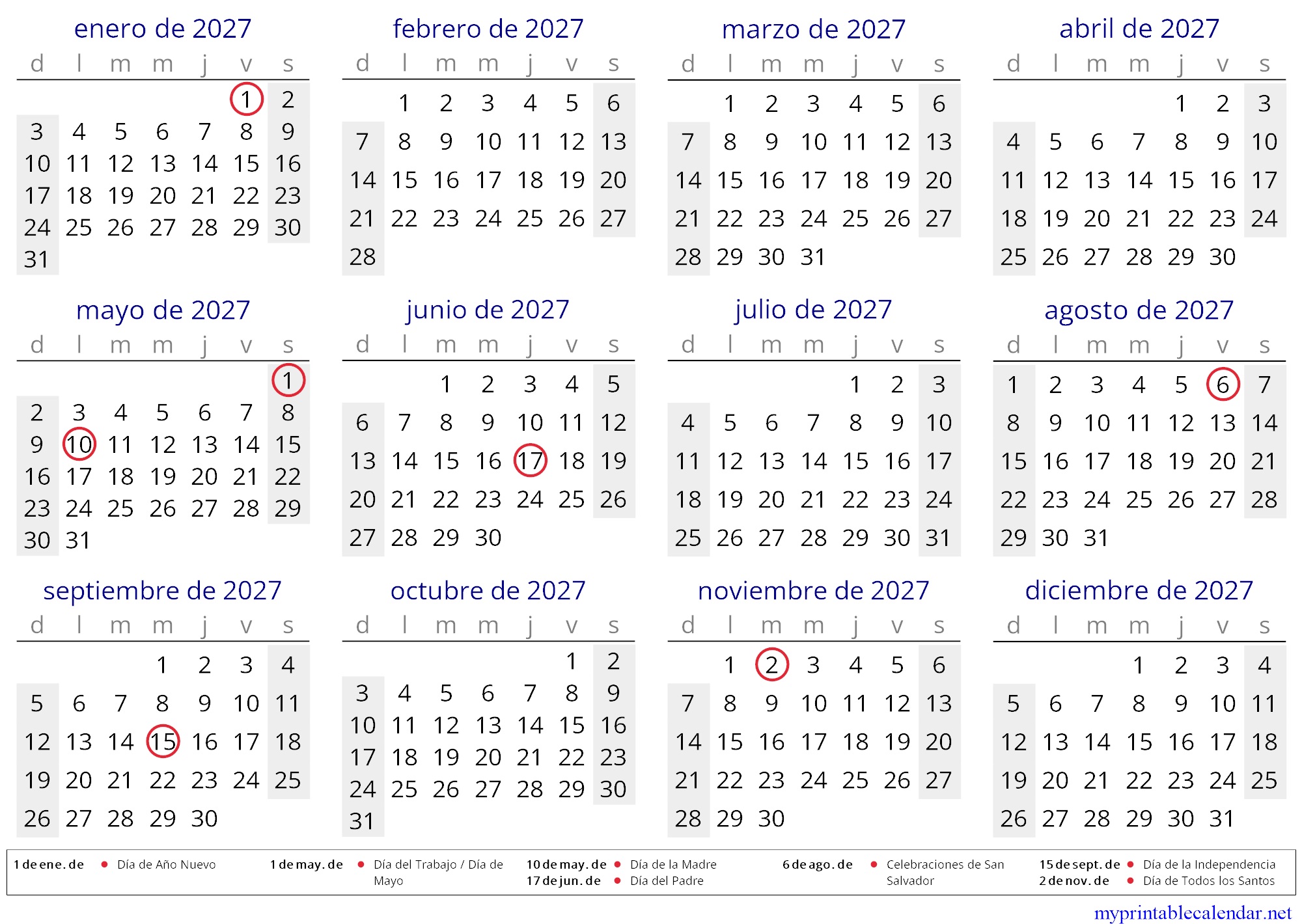 Yearly calendar for 2027, El Salvador, Spanish jpg