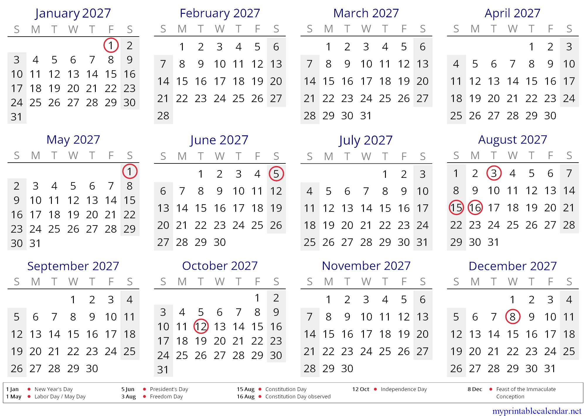 Yearly calendar for 2027, Equatorial Guinea, English jpg