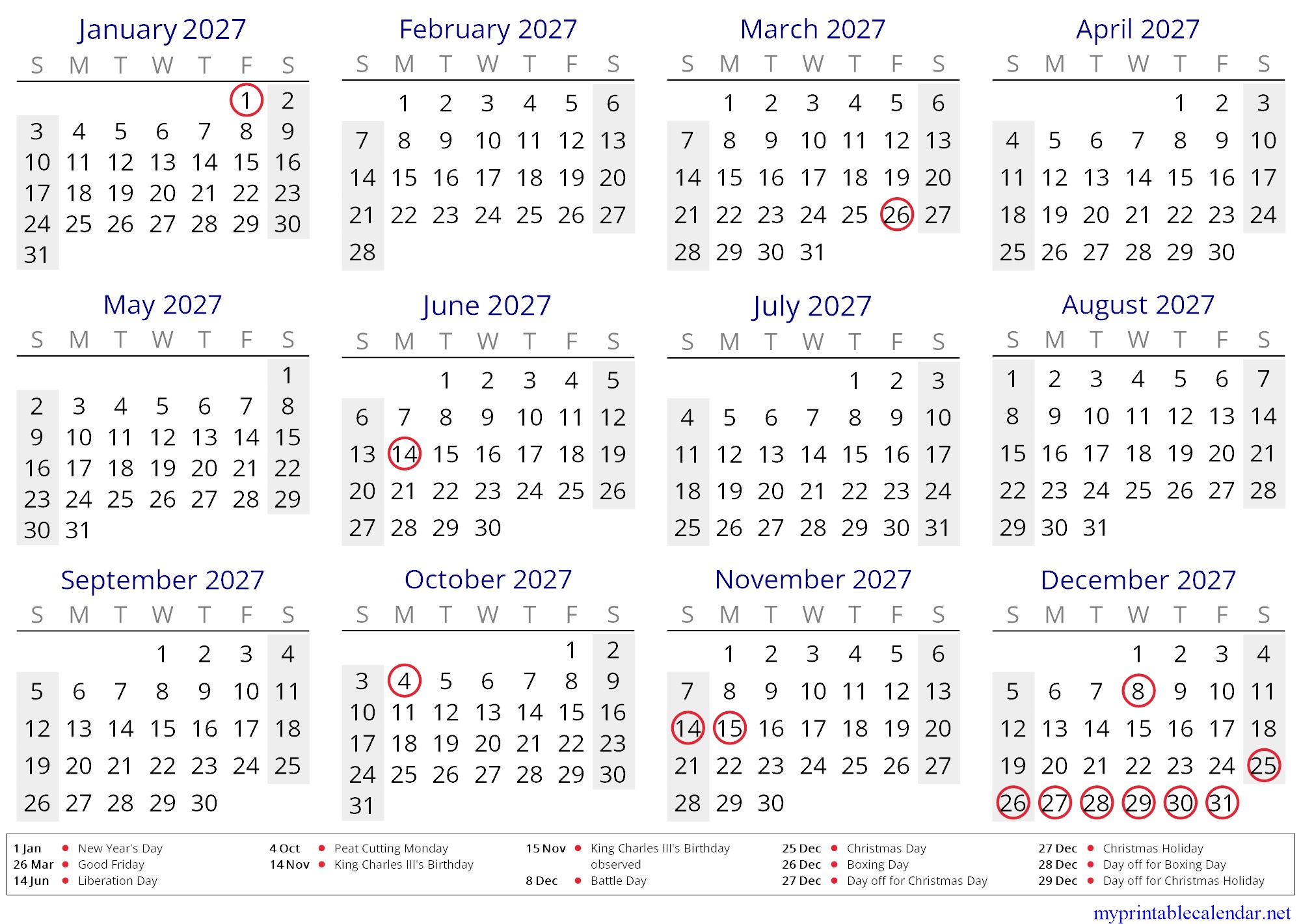 Yearly calendar for 2027, Falkland Islands, English jpg