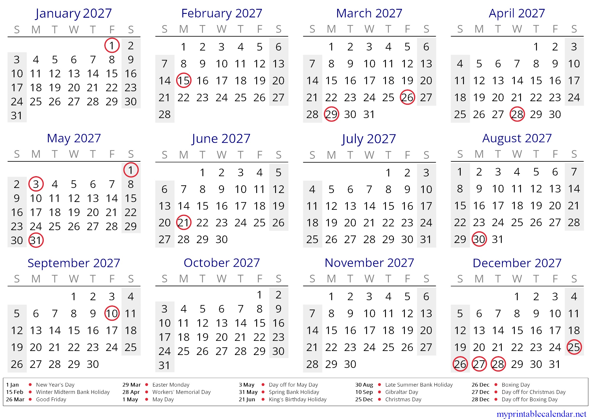 Yearly calendar for 2027, Gibraltar, English jpg