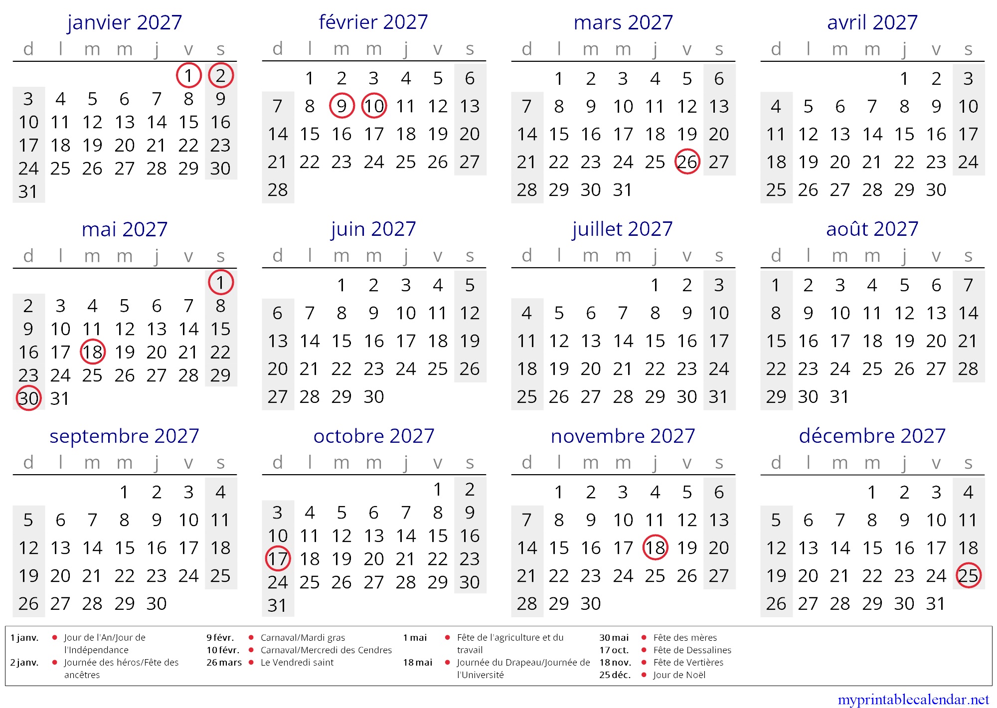 Yearly calendar for 2027, Haiti, French jpg