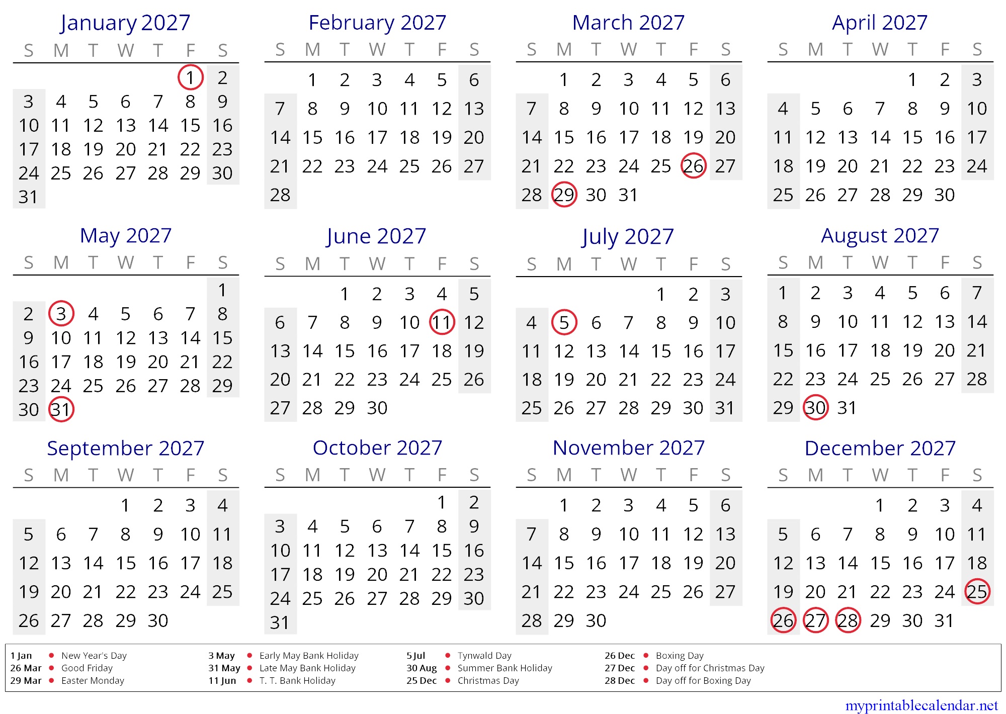 Yearly calendar for 2027, Isle of Man, English jpg