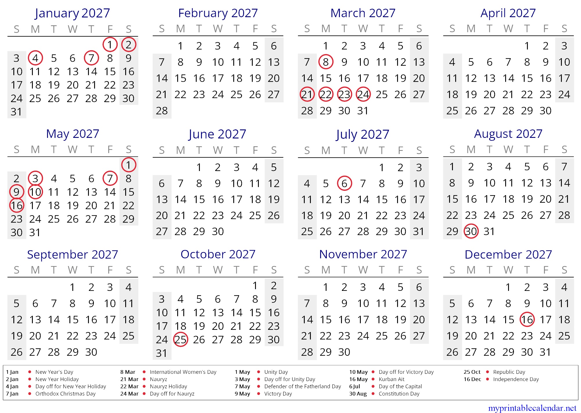 Yearly calendar for 2027, Kazakhstan, English jpg