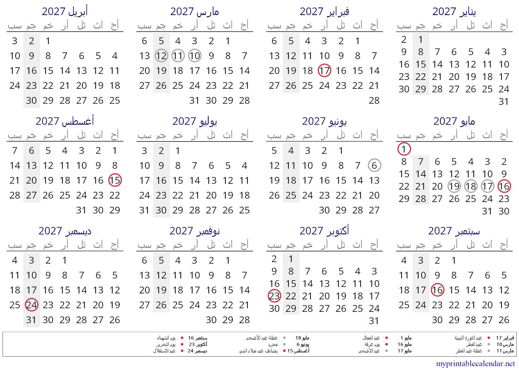 Yearly calendar for 2027, Libya, Arabic jpg
