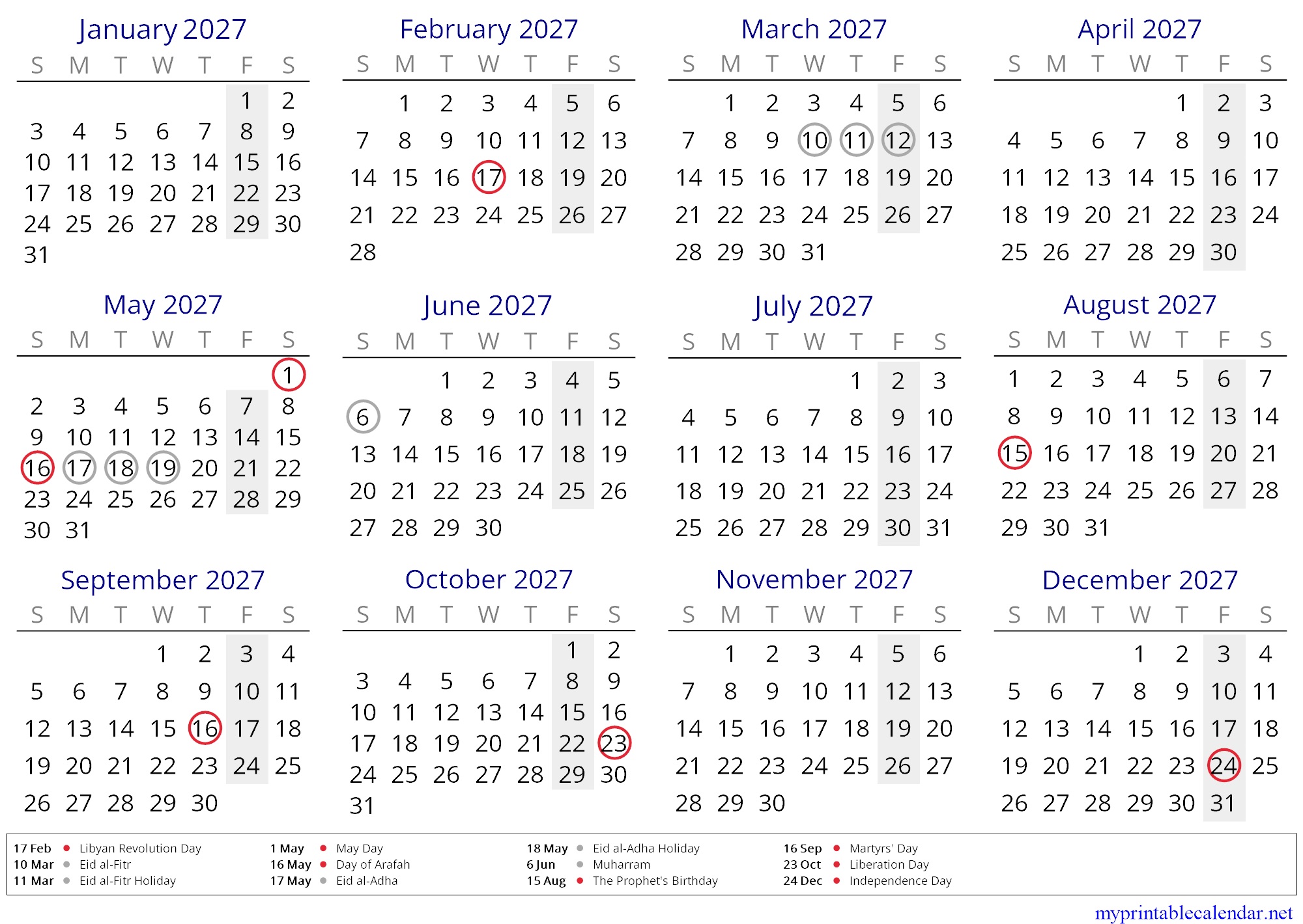 Yearly calendar for 2027, Libya, in English jpg
