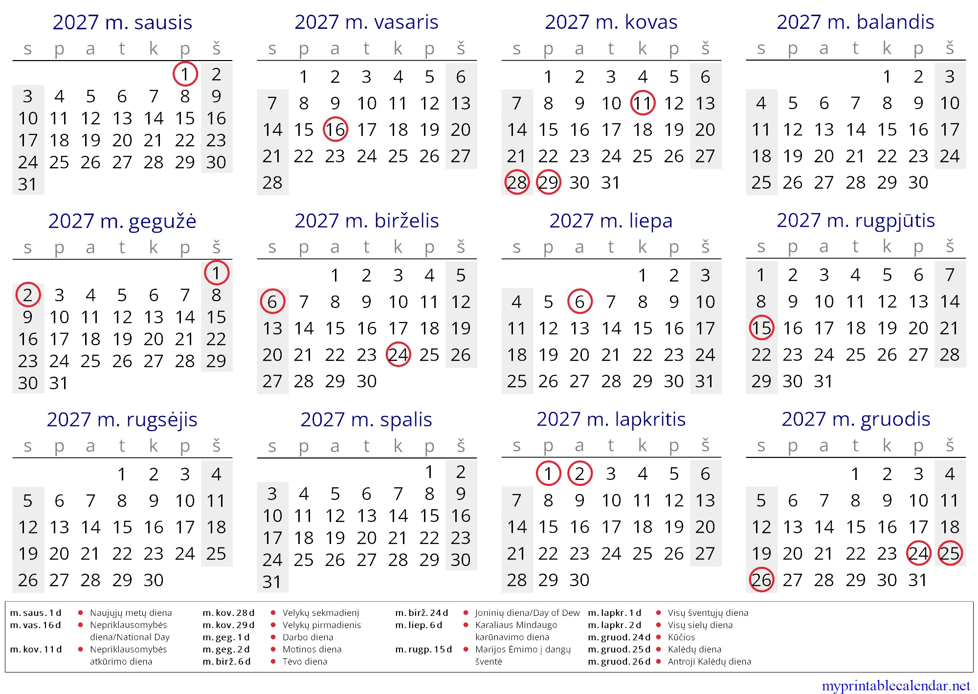 Yearly calendar for 2027, Lithuania, in English jpg