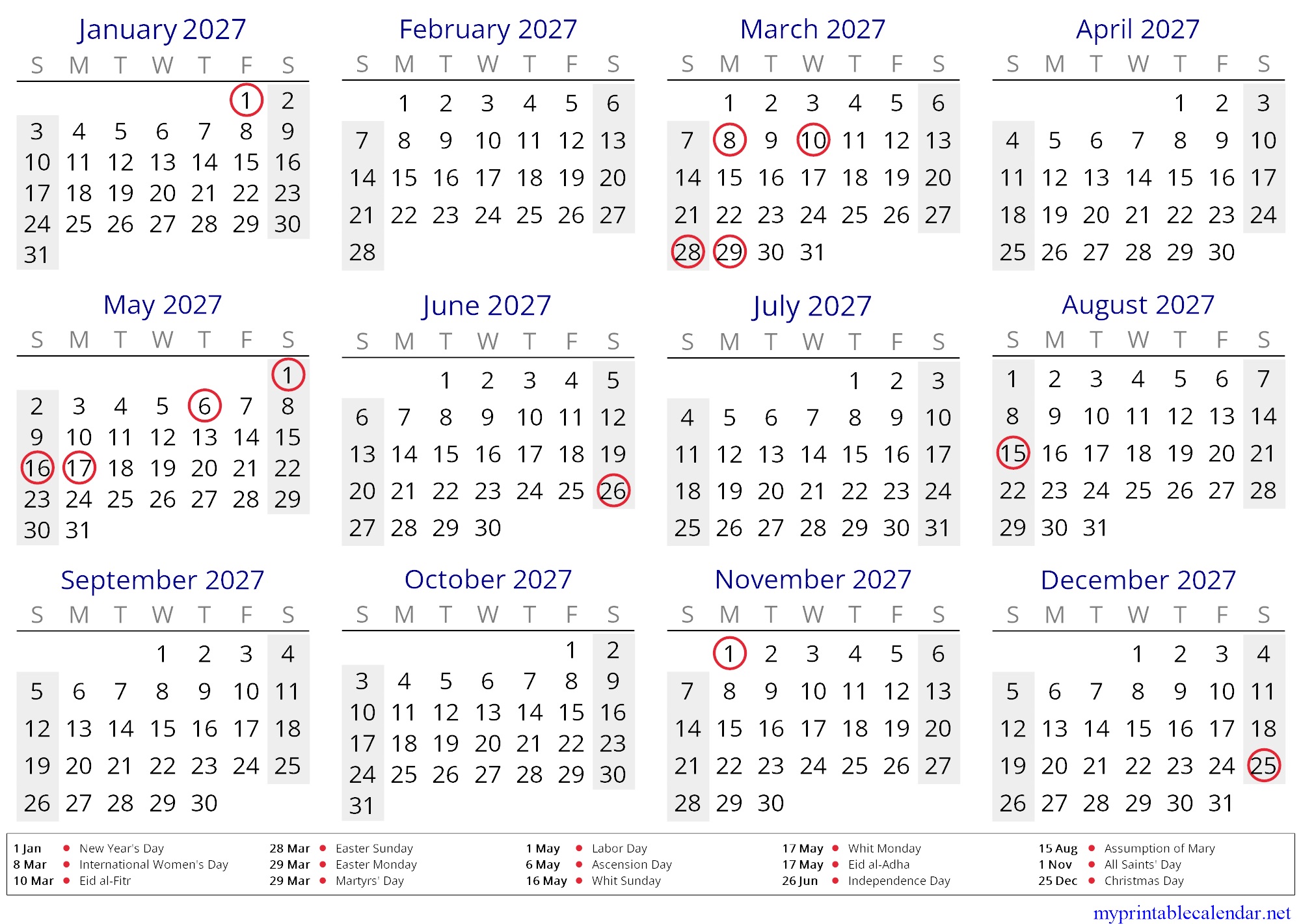 Yearly calendar for 2027, Madagascar, in English jpg