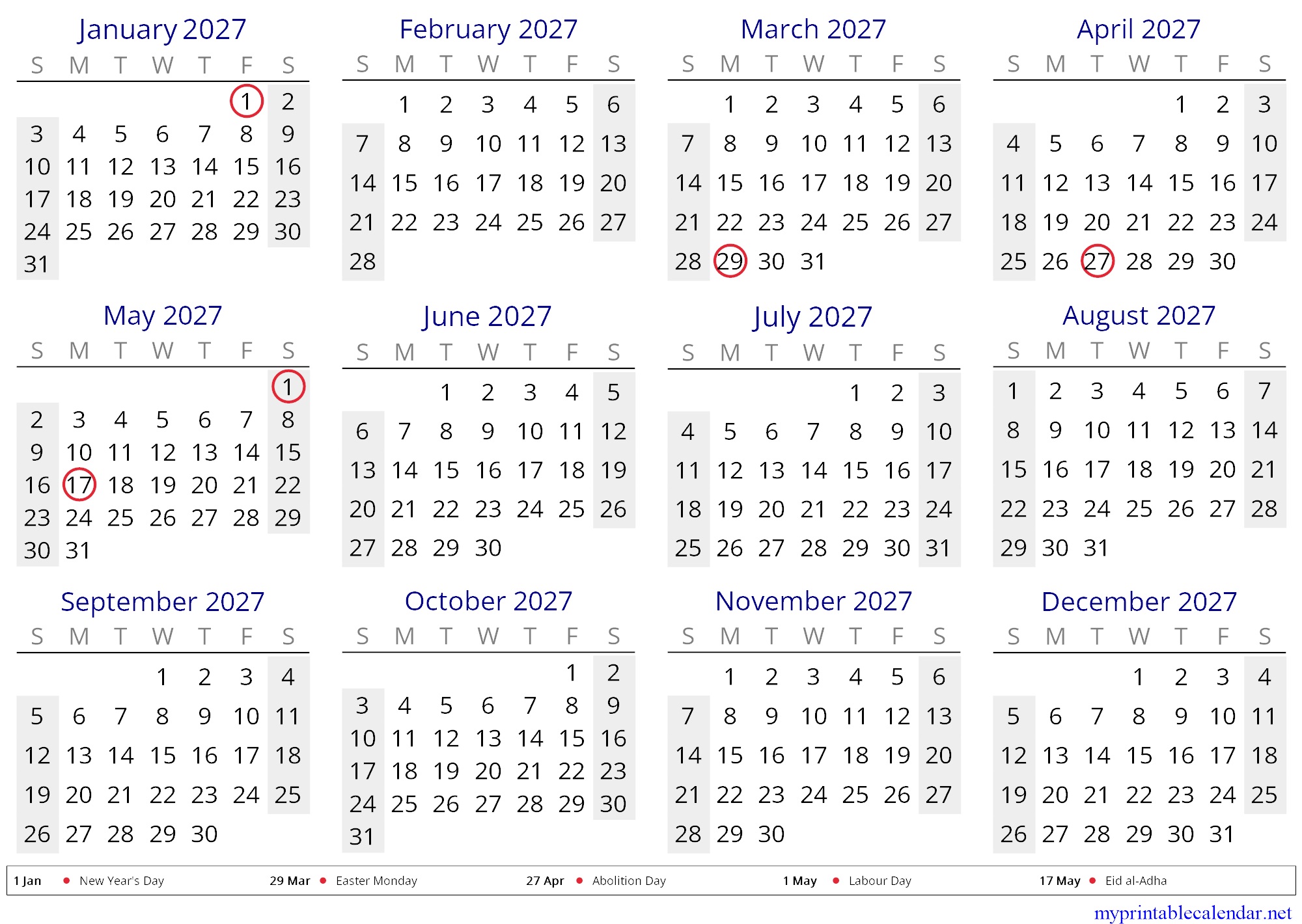 Yearly calendar for 2027, Mayotte, in English jpg