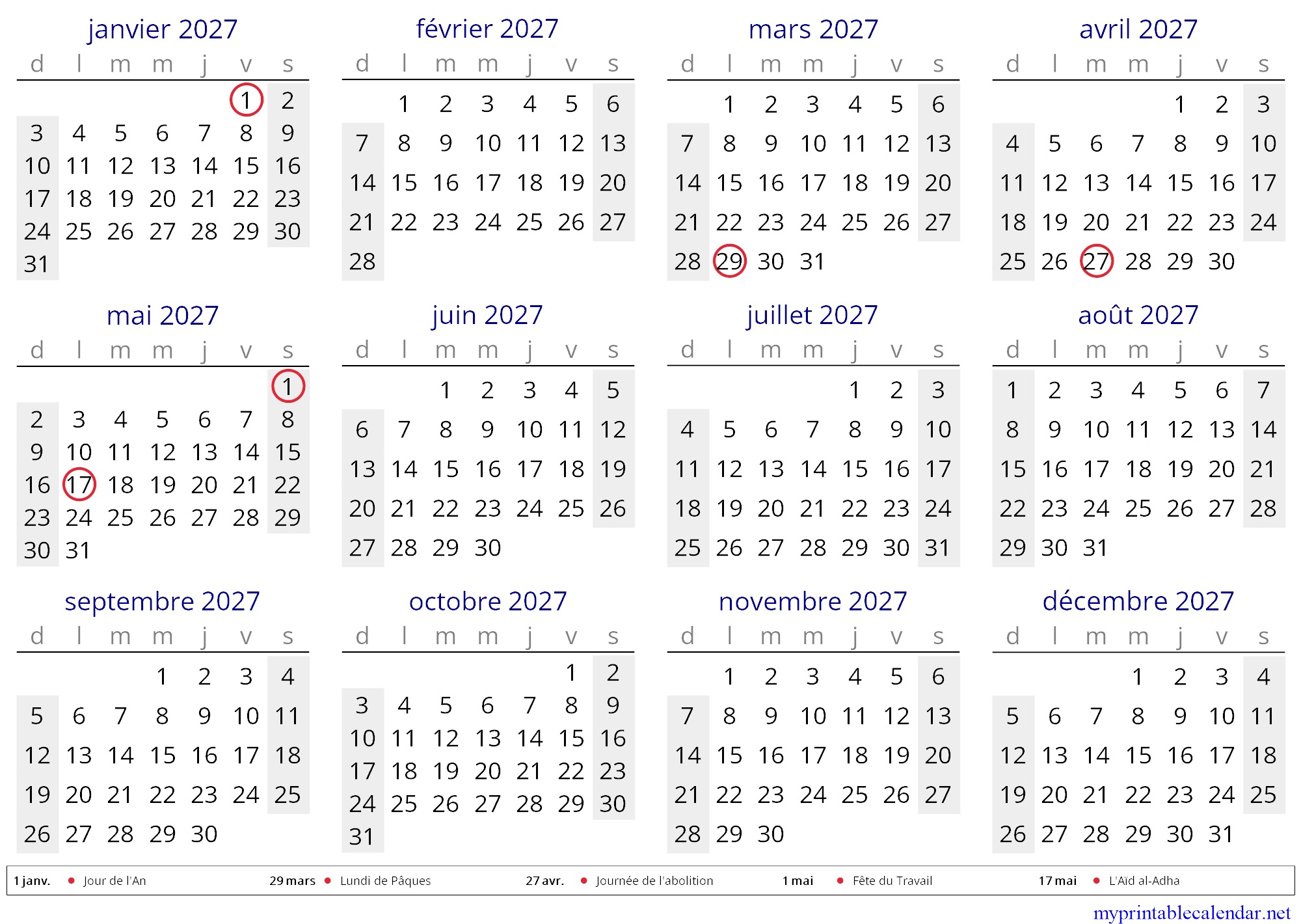 Yearly calendar for 2027, Mayotte, French jpg